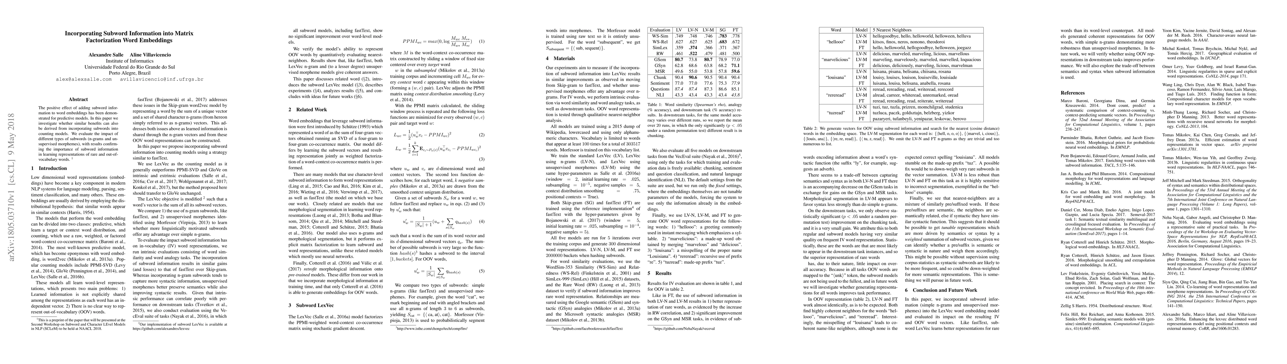 This paper explores enhancing matrix factorization word embeddings by integrating subword information, demonstrating benefits for rare and out-of-vocabulary words. Different subword types, like n-grams and unsupervised morphemes, are evaluated, confirming subword information's importance.