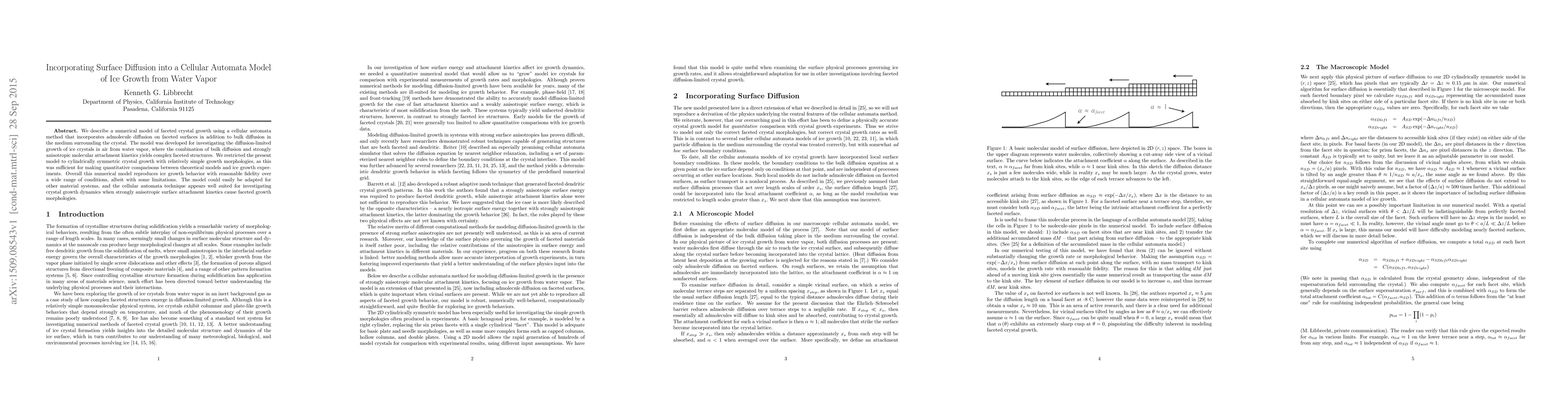 This paper presents a cellular automata model incorporating surface diffusion for simulating faceted ice crystal growth from water vapor, achieving reasonable fidelity in reproducing experimental growth behaviors. The model's adaptability suggests its utility for studying other materials with anisotropic surface attachment kinetics.