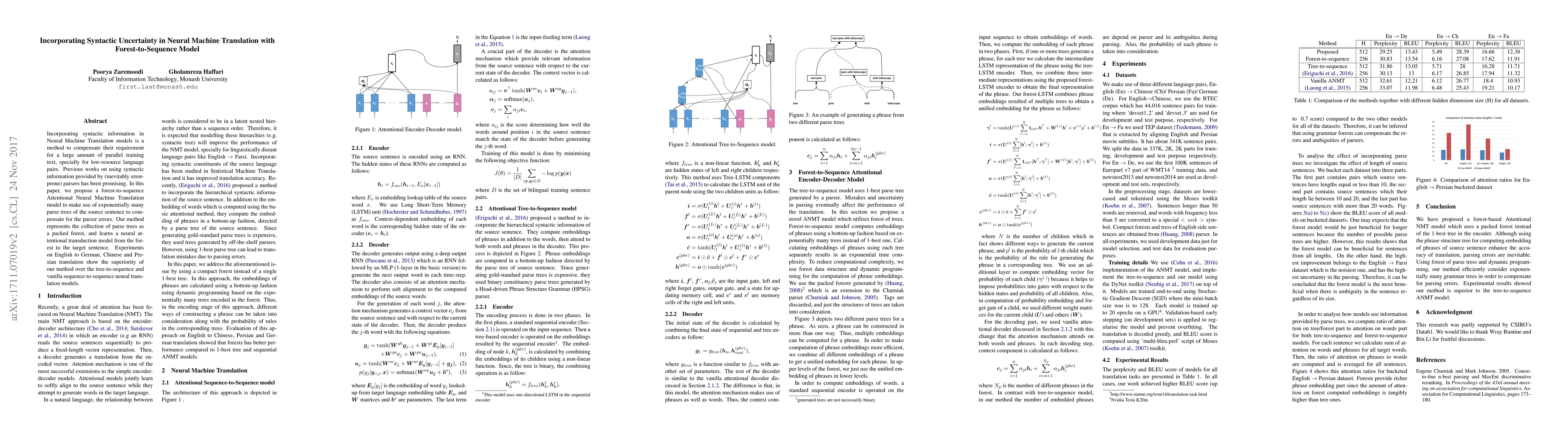 This paper proposes an Attentional Neural Machine Translation model that uses a packed forest of parse trees to incorporate syntactic uncertainty, improving translation quality for low-resource language pairs. The forest-to-sequence model outperforms traditional sequence-to-sequence and tree-to-sequence models in English to German, Chinese, and Persian translations.