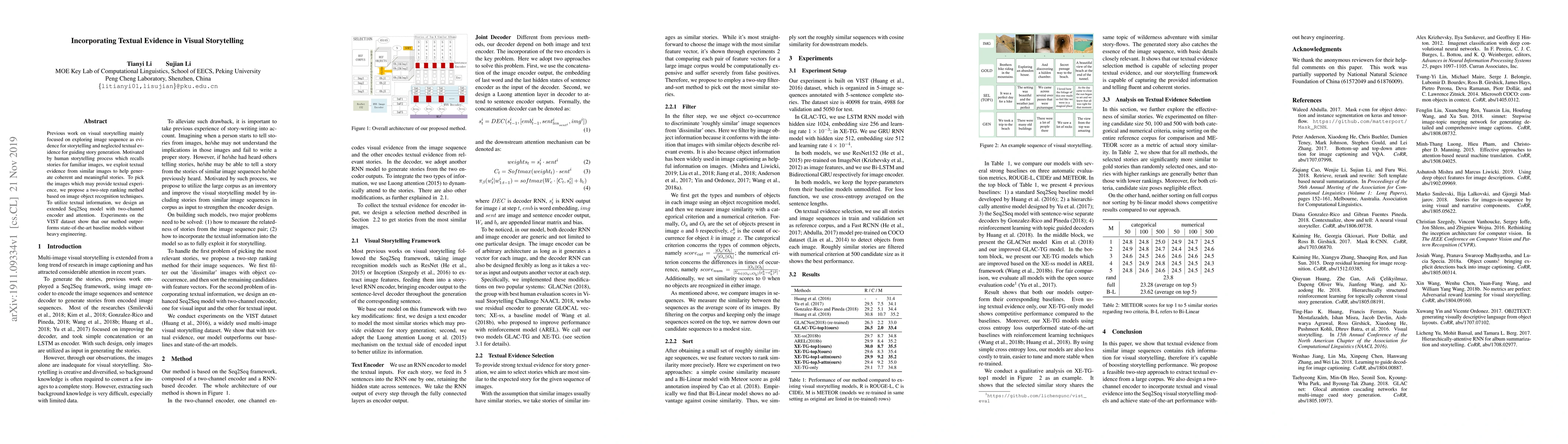 This paper proposes a method to enhance visual storytelling by incorporating textual evidence from similar images, using a two-step ranking method and an extended Seq2Seq model with a two-channel encoder and attention mechanism. Experiments demonstrate its effectiveness over baseline models on the VIST dataset.
