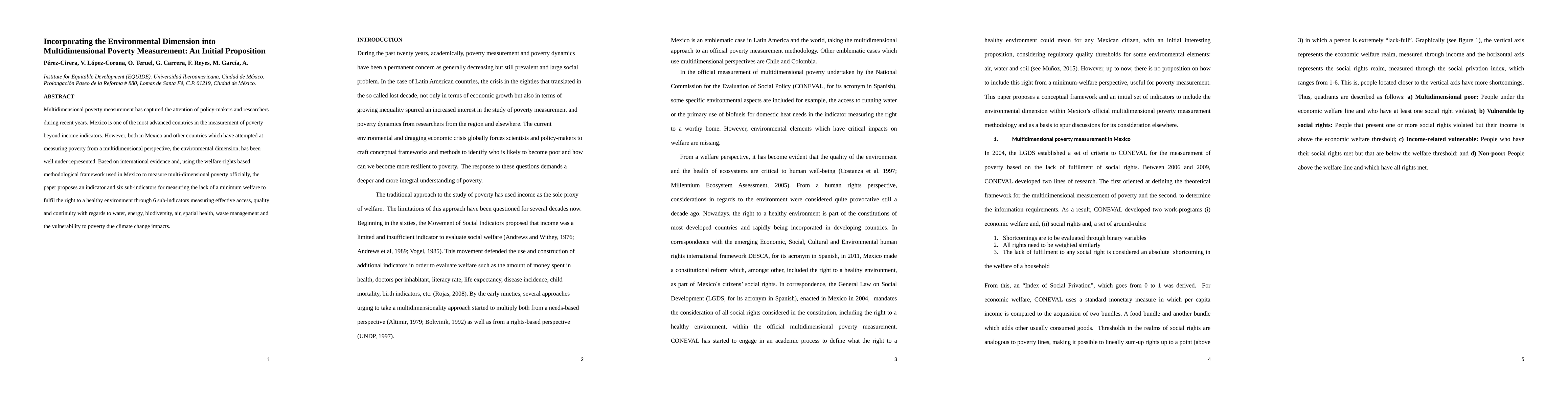 Multidimensional poverty measurement has captured the attention of policy-makers and researchers during recent years. Mexico is one of the most advanced countries in the measurement of poverty beyond income indicators. However, both in Mexico and other countries which have attempted at measuring poverty from a multidimensional perspective, the environmental dimension, has been well under-represented. Based on international evidence and, using the welfare-rights based methodological framework used in Mexico to measure multi-dimensional poverty officially, the paper proposes an indicator and six sub-indicators for measuring the lack of a minimum welfare to fulfil the right to a healthy environment through 6 sub-indicators measuring effective access, quality and continuity with regards to water, energy, biodiversity, air, spatial health, waste management and the vulnerability to poverty from climate change impacts.