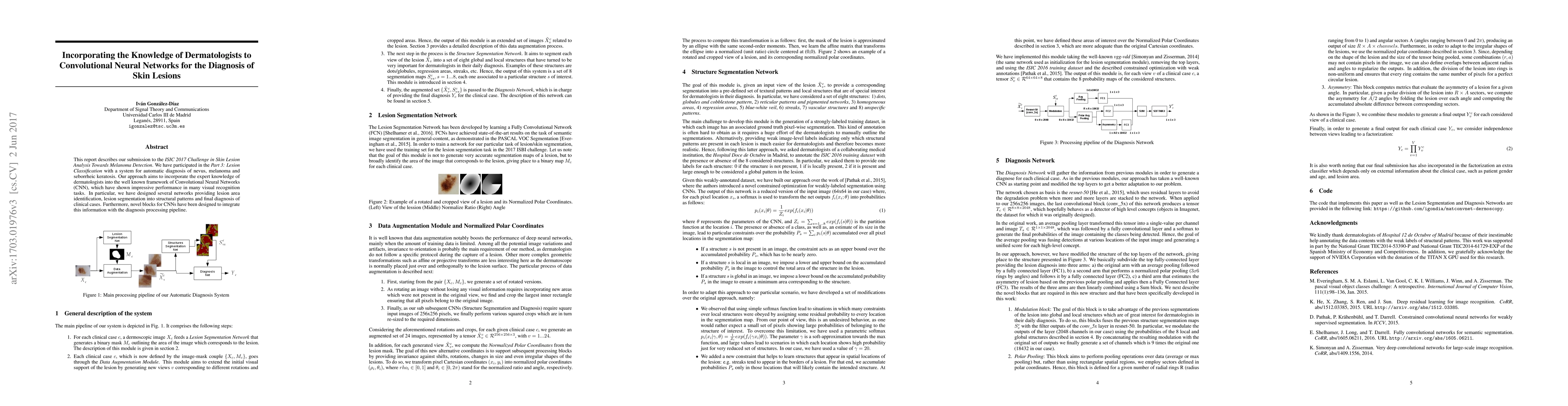This report describes our submission to the ISIC 2017 Challenge in Skin Lesion Analysis Towards Melanoma Detection. We have participated in the Part 3: Lesion Classification with a system for automatic diagnosis of nevus, melanoma and seborrheic keratosis. Our approach aims to incorporate the expert knowledge of dermatologists into the well known framework of Convolutional Neural Networks (CNN), which have shown impressive performance in many visual recognition tasks. In particular, we have designed several networks providing lesion area identification, lesion segmentation into structural patterns and final diagnosis of clinical cases. Furthermore, novel blocks for CNNs have been designed to integrate this information with the diagnosis processing pipeline.