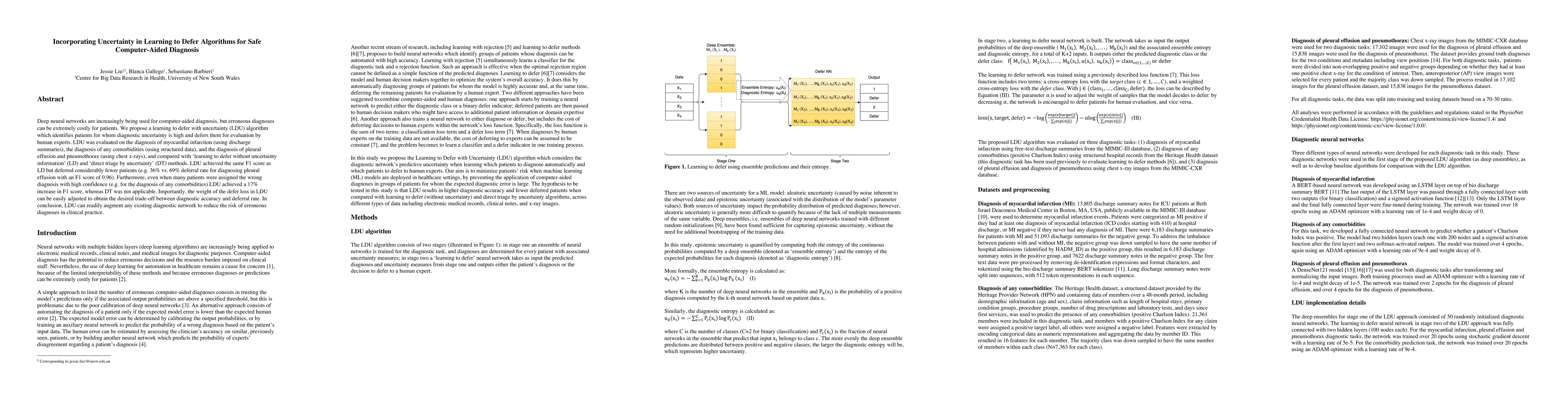 Deep neural networks are increasingly being used for computer-aided diagnosis, but erroneous diagnoses can be extremely costly for patients. We propose a learning to defer with uncertainty (LDU) algorithm which identifies patients for whom diagnostic uncertainty is high and defers them for evaluation by human experts. LDU was evaluated on the diagnosis of myocardial infarction (using discharge summaries), the diagnosis of any comorbidities (using structured data), and the diagnosis of pleural effusion and pneumothorax (using chest x-rays), and compared with 'learning to defer without uncertainty information' (LD) and 'direct triage by uncertainty' (DT) methods. LDU achieved the same F1 score as LD but deferred considerably fewer patients (e.g. 36% vs. 69% deferral rate for diagnosing pleural effusion with an F1 score of 0.96). Furthermore, even when many patients were assigned the wrong diagnosis with high confidence (e.g. for the diagnosis of any comorbidities) LDU achieved a 17% increase in F1 score, whereas DT was not applicable. Importantly, the weight of the defer loss in LDU can be easily adjusted to obtain the desired trade-off between diagnostic accuracy and deferral rate. In conclusion, LDU can readily augment any existing diagnostic network to reduce the risk of erroneous diagnoses in clinical practice.