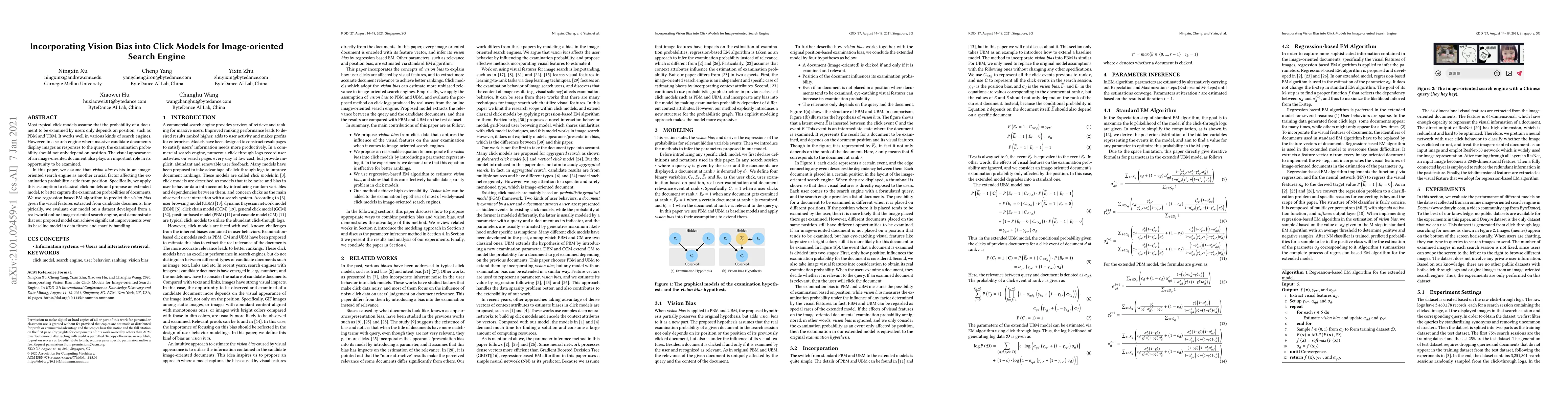 Most typical click models assume that the probability of a document to be examined by users only depends on position, such as PBM and UBM. It works well in various kinds of search engines. However, in a search engine where massive candidate documents display images as responses to the query, the examination probability should not only depend on position. The visual appearance of an image-oriented document also plays an important role in its opportunity to be examined. In this paper, we assume that vision bias exists in an image-oriented search engine as another crucial factor affecting the examination probability aside from position. Specifically, we apply this assumption to classical click models and propose an extended model, to better capture the examination probabilities of documents. We use regression-based EM algorithm to predict the vision bias given the visual features extracted from candidate documents. Empirically, we evaluate our model on a dataset developed from a real-world online image-oriented search engine, and demonstrate that our proposed model can achieve significant improvements over its baseline model in data fitness and sparsity handling.