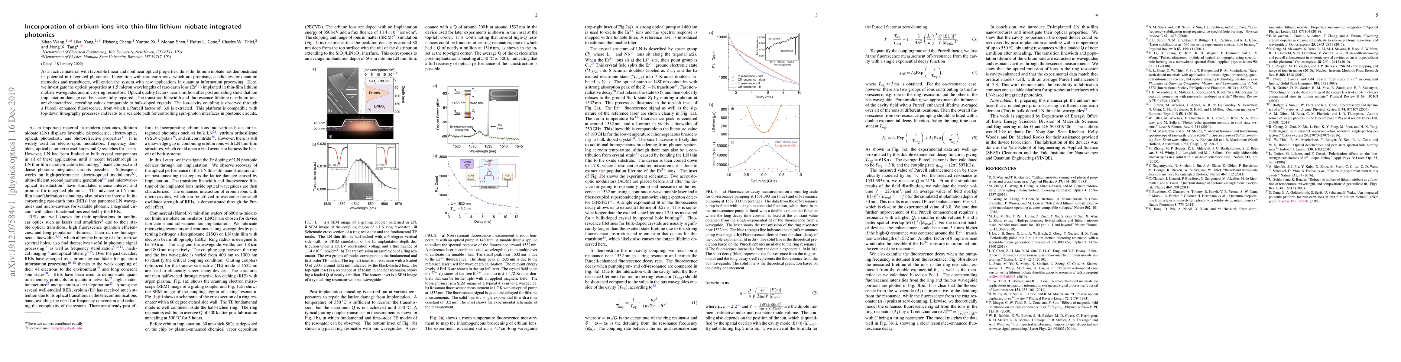 This study investigates the incorporation of erbium ions into thin-film lithium niobate waveguides and resonators, demonstrating successful repair of implantation damage and comparable optical properties to bulk crystals. The platform shows scalable potential for quantum information processing through enhanced fluorescence and spin-photon interface control.