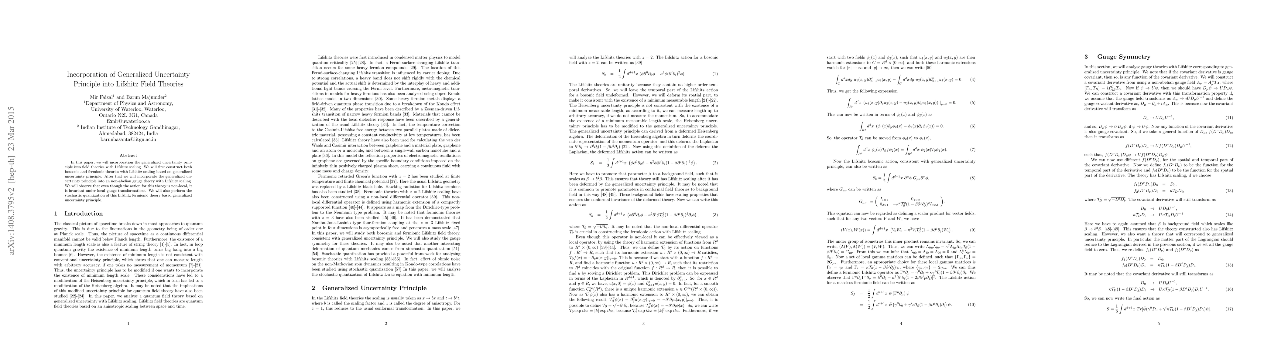 This paper constructs bosonic and fermionic field theories with Lifshitz scaling incorporating the generalized uncertainty principle, and demonstrates invariance under local gauge transformations in a non-abelian gauge theory. Stochastic quantization is performed on the Lifshitz fermionic theory based on this principle.