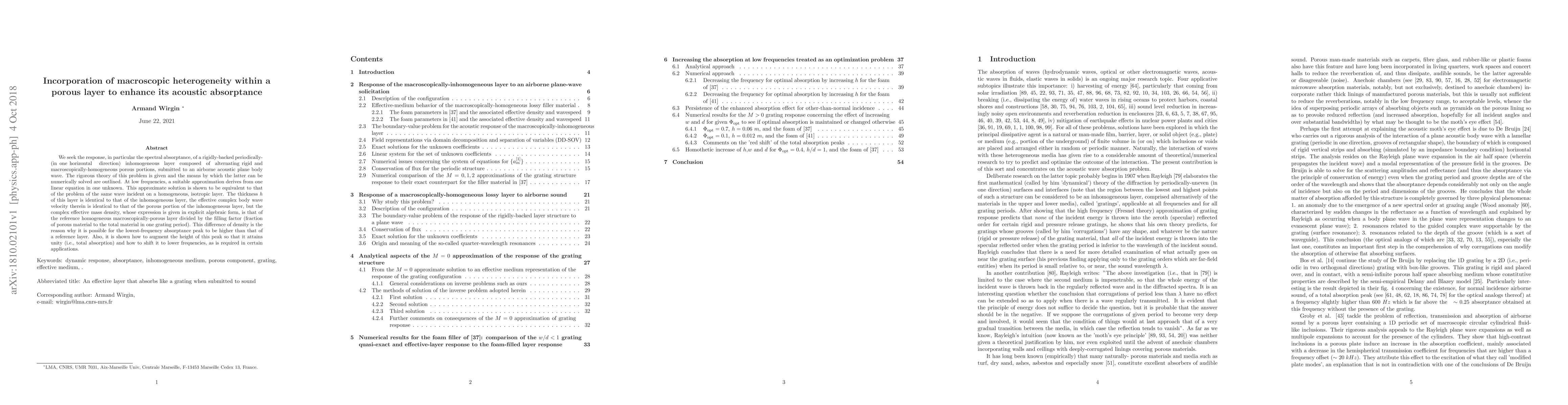 We seek the response, in particular the spectral absorptance, of a rigidly-backed periodically-(in one horizontal~~ direction) ~inhomogeneous ~layer ~composed ~of ~alternating rigid and macroscopically-homogeneous porous portions, submitted to an airborne acoustic plane body wave. The rigorous theory of this problem is given and the means by which the latter can be numerically solved are outlined. At low frequencies, a suitable approximation derives from one linear equation in one unknown. This approximate solution is shown to be equivalent to that of the problem of the same wave incident on a homogeneous, isotropic layer. The thickness $h$ of this layer is identical to that of the inhomogeneous layer, the effective complex body wave velocity therein is identical to that of the porous portion of the inhomogeneous layer, but the complex effective mass density, whose expression is given in explicit algebraic form, is that of the reference homogeneous macroscopically-porous layer divided by the filling factor (fraction of porous material to the total material in one grating period). This difference of density is the reason why it is possible for the lowest-frequency absorptance peak to be higher than that of a reference layer. Also, it is shown how to augment the height of this peak so that it attains unity (i.e., total absorption) and how to shift it to lower frequencies, as is required in certain applications.