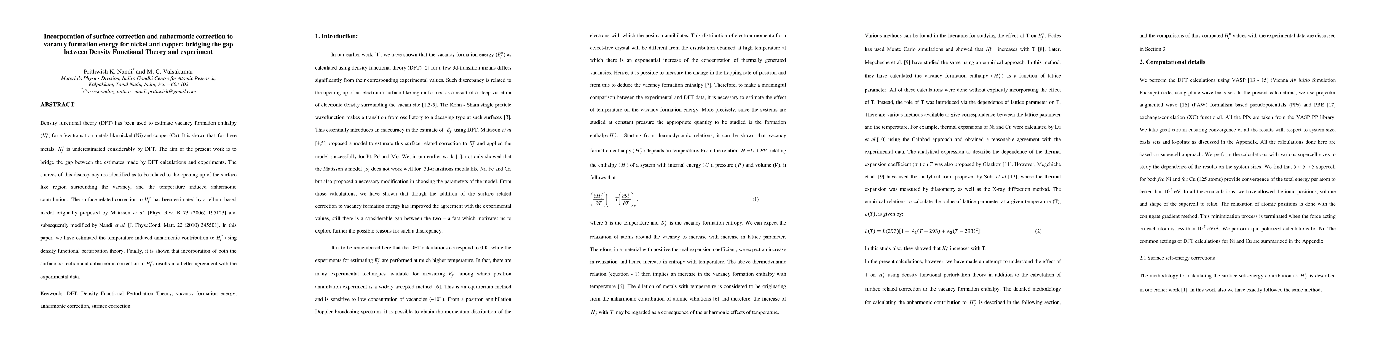 This paper investigates the discrepancy between DFT calculations and experimental data on vacancy formation enthalpy in nickel and copper, attributing it to surface and anharmonic effects. By incorporating surface correction and anharmonic correction, the study achieves better alignment with experimental results.