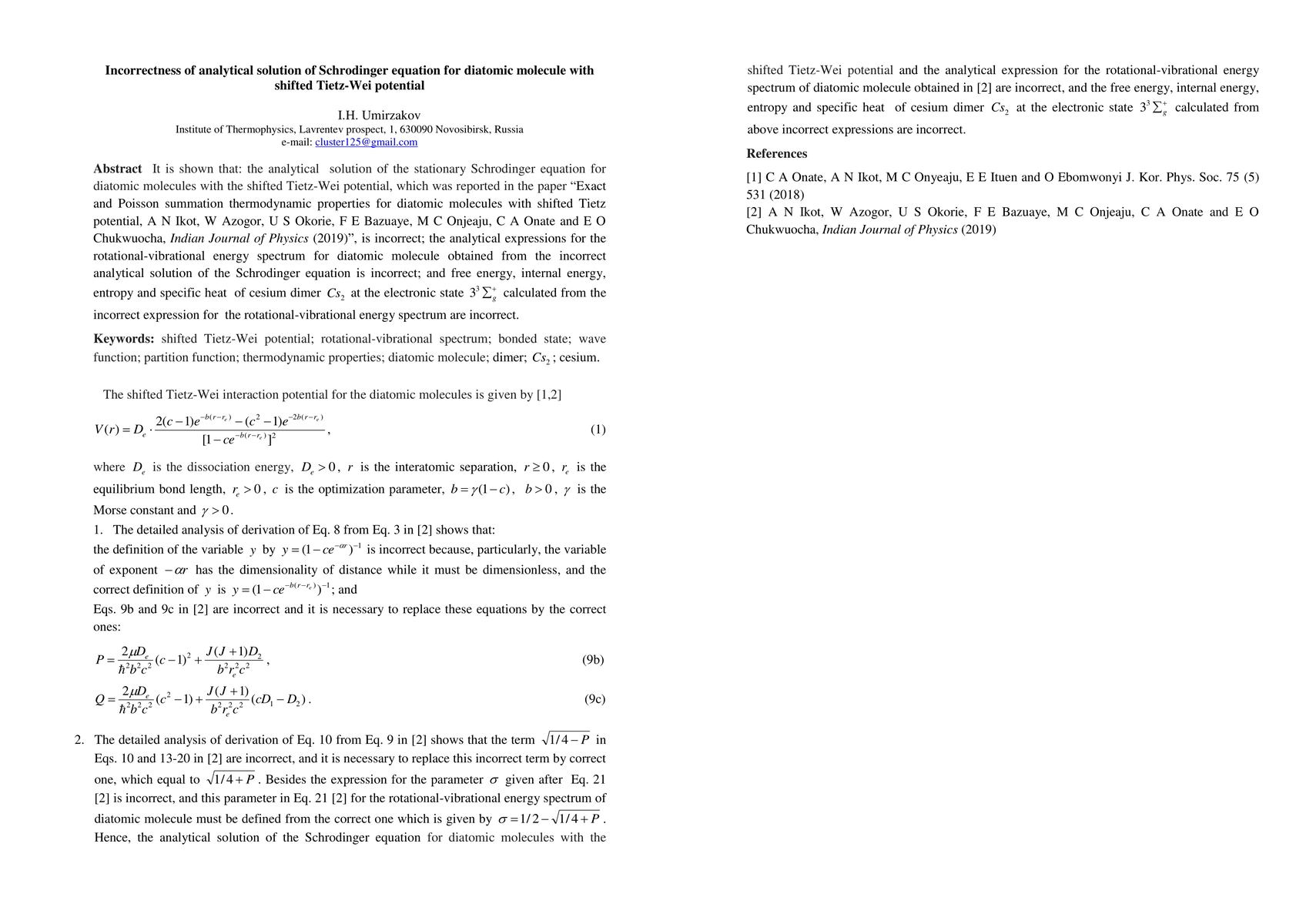 It is shown that: the analytical solution of the stationary Schrodinger equation for diatomic molecules with the shifted Tietz-Wei potential, which was reported in the paper Exact and Poisson summation thermodynamic properties for diatomic molecules with shifted Tietz potential, A N Ikot, W Azogor, U S Okorie, F E Bazuaye, M C Onjeaju, C A Onate and E O Chukwuocha, Indian Journal of Physics, 2019, is incorrect; the analytical expressions for the rotational-vibrational energy spectrum for diatomic molecule obtained from the incorrect analytical solution of the Schrodinger equation is incorrect; and free energy, internal energy, entropy and specific heat of cesium dimer at the electronic state calculated from the incorrect expression for the rotational-vibrational energy spectrum are incorrect.