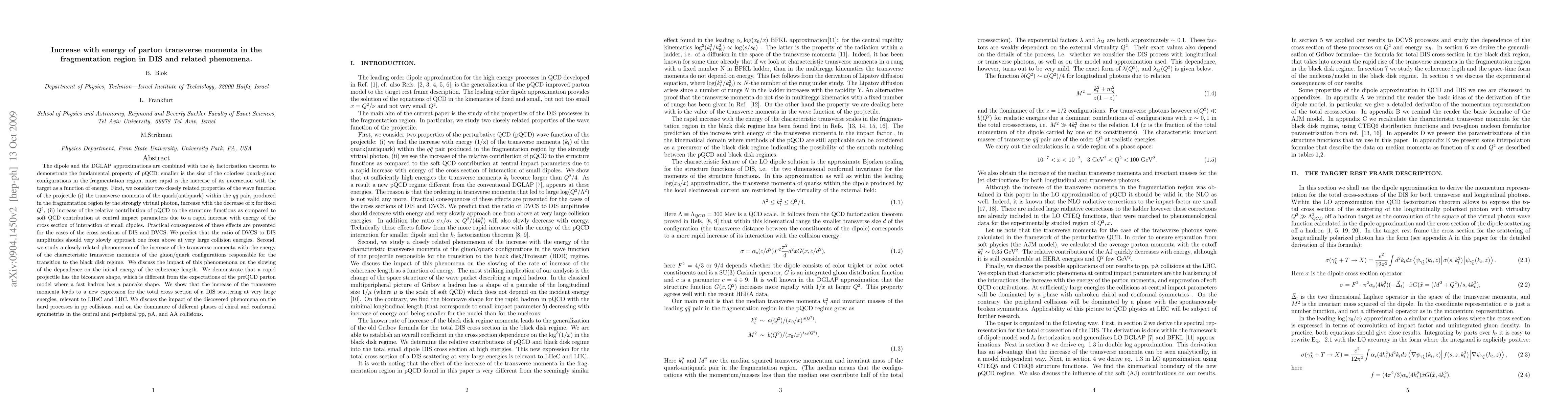 The dipole and the DGLAP approximations are combined with the $k_t$ factorization theorem to demonstrate the fundamental property of pQCD: smaller is the size of the colorless quark-gluon configurations in the fragmentation region, more rapid is the increase of its interaction with the target as a function of energy. First, we show that the transverse momenta of the quark(antiquark) within the $q\bar{q}$ pair, produced in the fragmentation region by the strongly virtual photon, increase with the decrease of x for fixed $Q^2$. As practical consequence of these effects we show that the cross sections of DIS and DVCS. We predict that the ratio of DVCS to DIS amplitudes should very slowly approach one from above at very large collision energies. Second, we study a closely related phenomenon of the increase of the transverse momenta with the energy of the characteristic transverse momenta of the gluon/quark configurations responsible for the transition to the black disk regime. We discuss the impact of this phenomenona on the slowing of the dependence on the initial energy of the coherence length. We demonstrate that a rapid projectile has the biconcave shape, which is different from the expectations of the preQCD parton model where a fast hadron has a pancake shape. We show that the increase of the transverse momenta leads to a new expression for the total cross section of a DIS scattering at very large energies, relevant to LHeC and LHC. We discuss the impact of the discovered phenomena on the hard processes in pp collisions, and on the dominance ofdifferent phases of chiral and conformal symmetries in the central and peripheral pp, pA, and AA collisions.