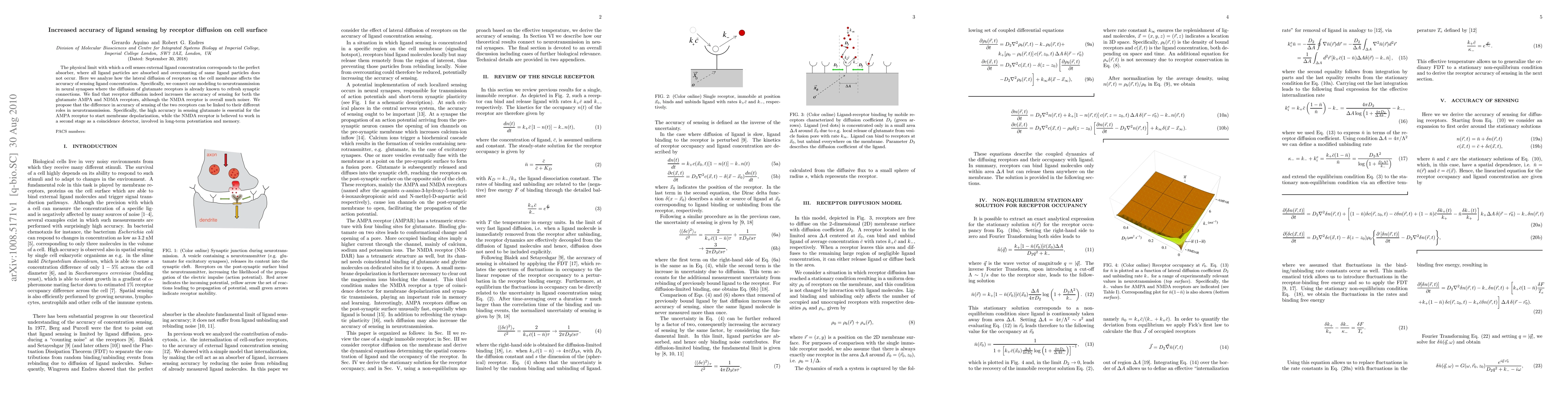 This paper investigates how receptor diffusion on cell membranes enhances ligand sensing accuracy, particularly in neurotransmission. The study finds that receptor diffusion improves the accuracy of glutamate sensing by AMPA and NMDA receptors, with AMPA being more precise, essential for initial depolarization, while NMDA functions as a noiser coincidence detector in memory processes.