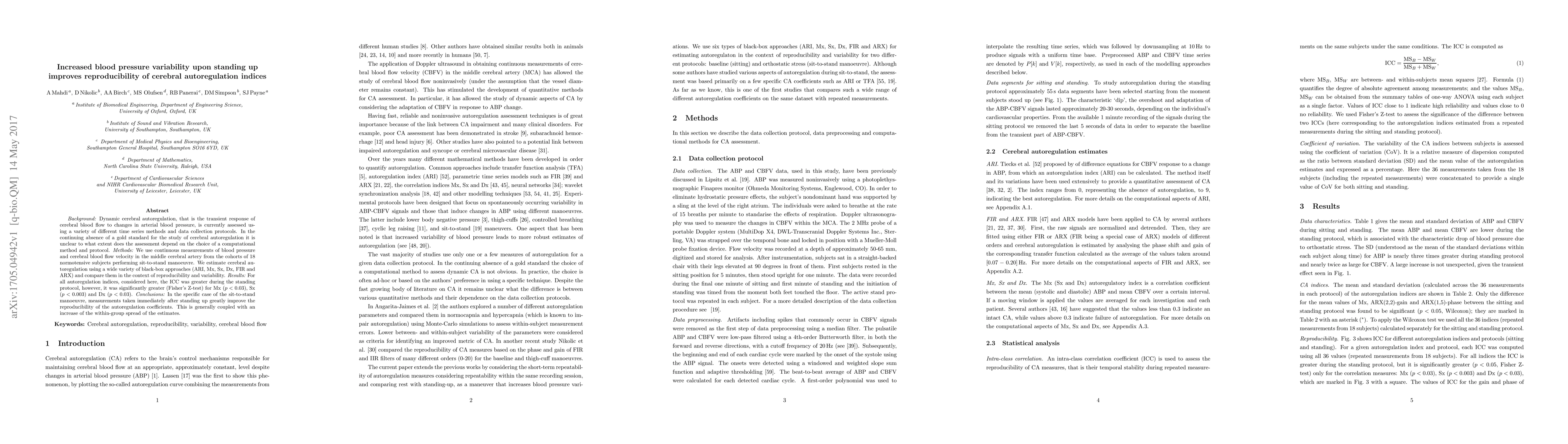 This study finds that increased blood pressure variability upon standing up enhances the reproducibility of cerebral autoregulation indices, particularly for Mx, Sx, and Dx. The sit-to-stand manoeuvre improves the reliability of these indices, although it also increases the within-group variability.