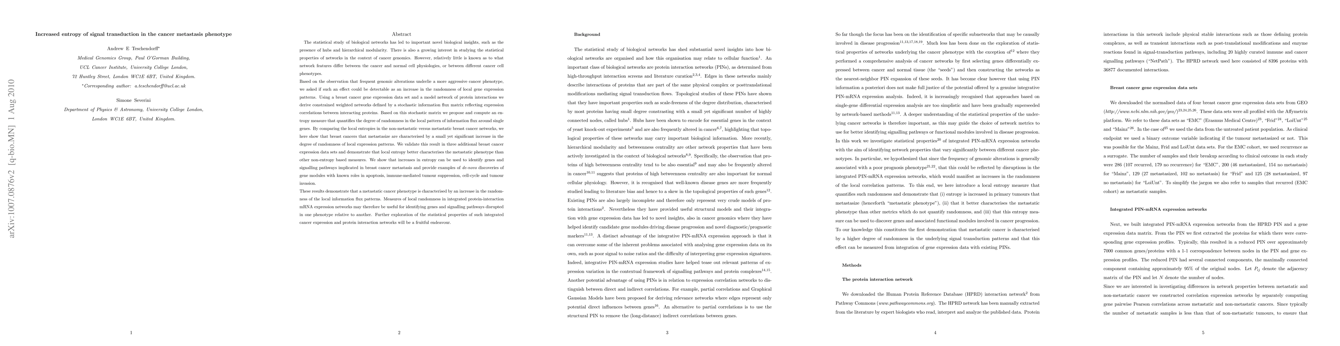 Studies into the statistical properties of biological networks have led to important biological insights, such as the presence of hubs and hierarchical modularity. There is also a growing interest in studying the statistical properties of networks in the context of cancer genomics. However, relatively little is known as to what network features differ between the cancer and normal cell physiologies, or between different cancer cell phenotypes. Based on the observation that frequent genomic alterations underlie a more aggressive cancer phenotype, we asked if such an effect could be detectable as an increase in the randomness of local gene expression patterns. Using a breast cancer gene expression data set and a model network of protein interactions we derive constrained weighted networks defined by a stochastic information flux matrix reflecting expression correlations between interacting proteins. Based on this stochastic matrix we propose and compute an entropy measure that quantifies the degree of randomness in the local pattern of information flux around single genes. By comparing the local entropies in the non-metastatic versus metastatic breast cancer networks, we here show that breast cancers that metastasize are characterised by a small yet significant increase in the degree of randomness of local expression patterns. We validate this result in three additional breast cancer expression data sets and demonstrate that local entropy better characterises the metastatic phenotype than other non-entropy based measures. We show that increases in entropy can be used to identify genes and signalling pathways implicated in breast cancer metastasis. Further exploration of such integrated cancer expression and protein interaction networks will therefore be a fruitful endeavour.