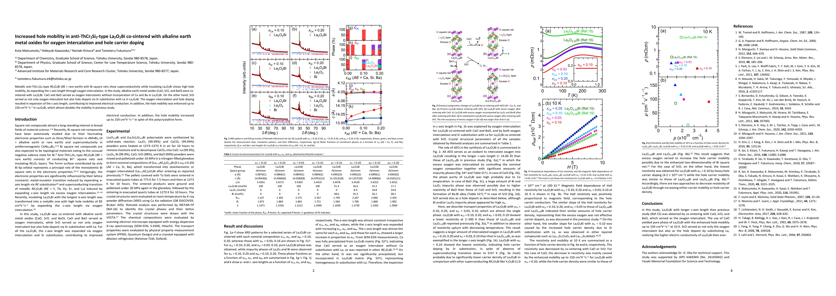 Metallic anti-ThCr$_2$Si$_2$-type $RE_2$O$_2$Bi ($RE$ = rare earth) with Bi square nets show superconductivity while insulating La$_2$O$_2$Bi shows high hole mobility, by expanding the c-axis length through oxygen intercalation. In this study, alkaline earth metal oxides (CaO, SrO, and BaO) were co-sintered with La$_2$O$_2$Bi. CaO and BaO served as oxygen intercalants without incorporation of Ca and Ba in La$_2$O$_2$Bi. On the other hand, SrO served as not only oxygen intercalant but also hole dopant via Sr substitution with La in La$_2$O$_2$Bi. The oxygen intercalation and hole doping resulted in expansion of the c-axis length, contributing to improved electrical conduction. In addition, the hole mobility was enhanced up to 150 cm$^2$V$^{-1}$s$^{-1}$ in La$_2$O$_2$Bi, which almost doubles the mobility in previous study.