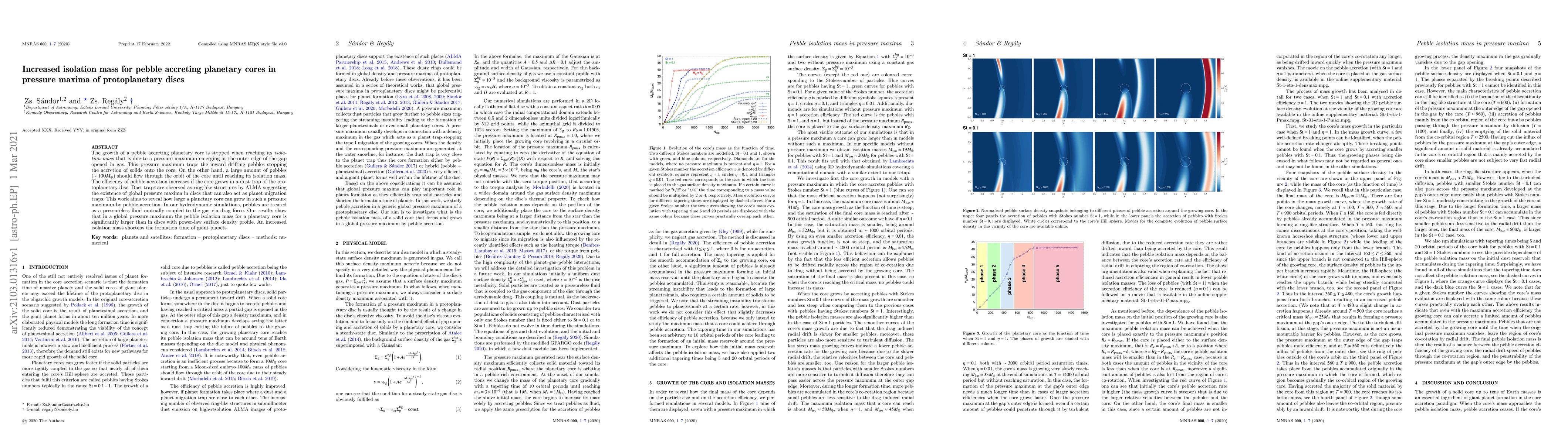 The study uses hydrodynamic simulations to model pebble accretion in a global pressure maximum of protoplanetary discs, treating pebbles as a pressureless fluid coupled to the gas via drag force in a 2D locally isothermal flat disc.