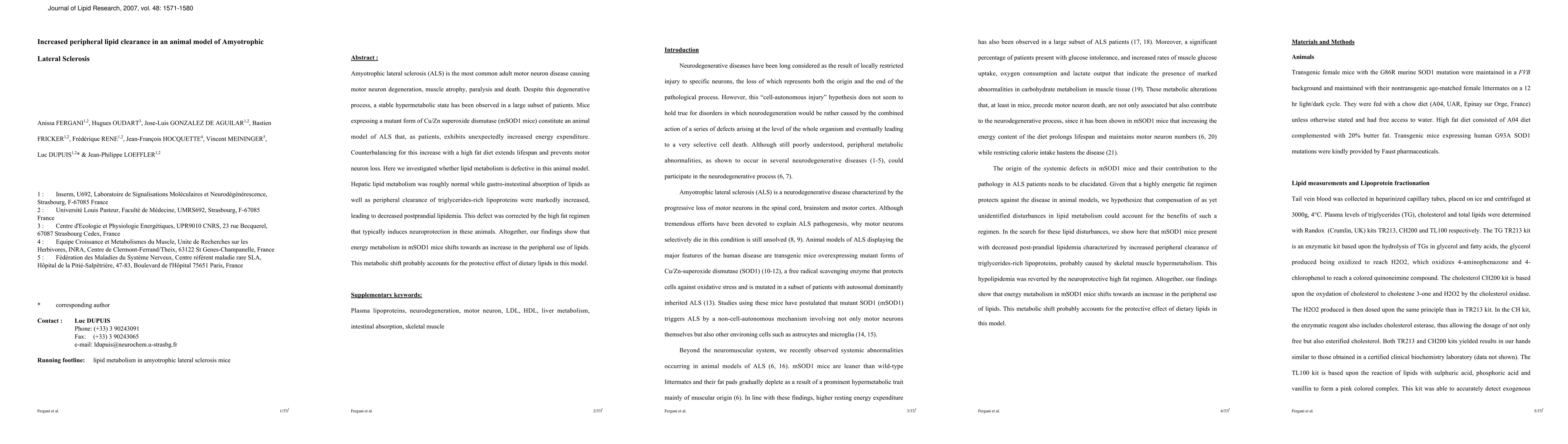 Amyotrophic lateral sclerosis (ALS) is the most common adult motor neuron disease, causing motor neuron degeneration, muscle atrophy, paralysis, and death. Despite this degenerative process, a stable hypermetabolic state has been observed in a large subset of patients. Mice expressing a mutant form of Cu/Zn-superoxide dismutase (mSOD1 mice) constitute an animal model of ALS that, like patients, exhibits unexpectedly increased energy expenditure. Counterbalancing for this increase with a high-fat diet extends lifespan and prevents motor neuron loss. Here, we investigated whether lipid metabolism is defective in this animal model. Hepatic lipid metabolism was roughly normal, whereas gastrointestinal absorption of lipids as well as peripheral clearance of triglyceride-rich lipoproteins were markedly increased, leading to decreased postprandial lipidemia. This defect was corrected by the high-fat regimen that typically induces neuroprotection in these animals. Together, our findings show that energy metabolism in mSOD1 mice shifts toward an increase in the peripheral use of lipids. This metabolic shift probably accounts for the protective effect of dietary lipids in this model.