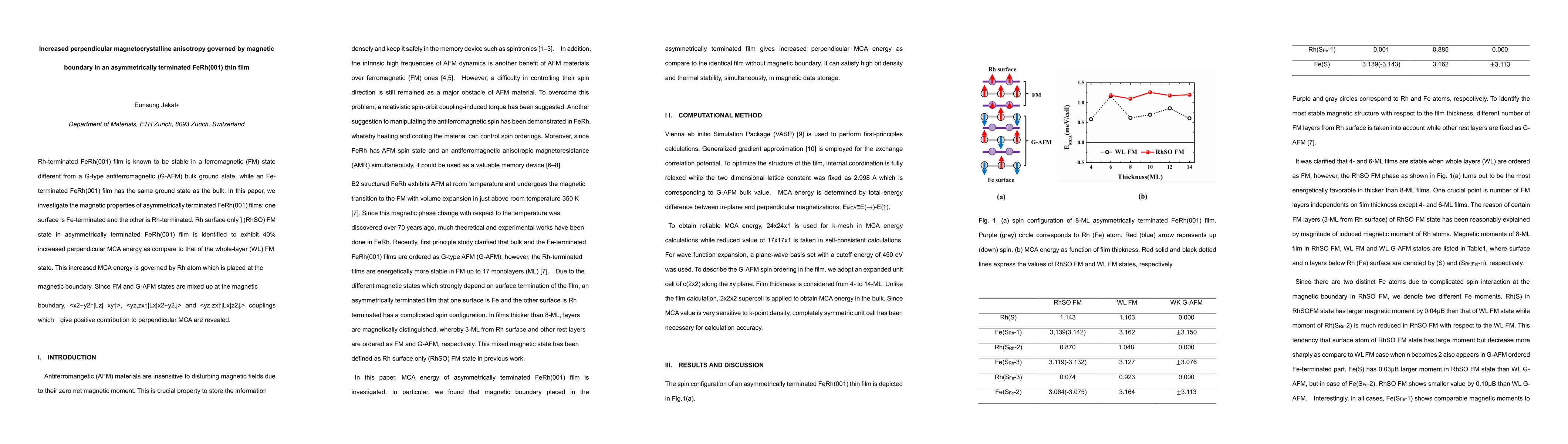 Rh-terminated FeRh(001) film is known to be stable in a ferromagnetic (FM) state different from a G-type antiferromagnetic (G-AFM) bulk ground state, while an Fe-terminated FeRh(001) film has the same ground state as the bulk. In this paper, we investigate the magnetic properties of asymmetrically terminated FeRh(001) films: one surface is Fe-terminated and the other is Rh-terminated. Rh surface only ] (RhSO) FM state in asymmetrically terminated FeRh(001) film is identified to exhibit 40% increased perpendicular MCA energy as compare to that of the whole-layer (WL) FM state. This increased MCA energy is governed by Rh atom which is placed at the magnetic boundary. Since FM and G-AFM states are mixed up at the magnetic boundary, spin-orbit couplings which give positive contribution to perpendicular MCA are revealed.