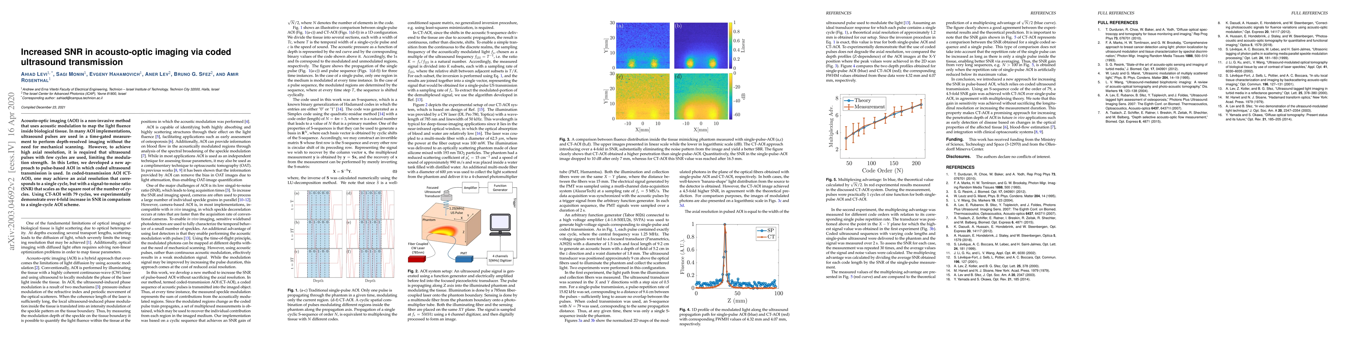 Acousto-optic imaging (AOI) is a non-invasive method that uses acoustic modulation to map the light fluence inside biological tissue. In many AOI implementations, ultrasound pulses are used in a time-gated measurement to perform depth-resolved imaging without the need for mechanical scanning. However, to achieve high axial resolution, it is required that ultrasound pulses with few cycles are used, limiting the modulation strength. In this Letter, we developed a new approach to pulse-based AOI in which a coded ultrasound transmission is used. In coded-transmission AOI (CT-AOI), one may achieve an axial resolution that corresponds to a single cycle, but with a signal-to-noise ratio (SNR) that scales as the square root of the number of cycles. Using CT-AOI with 79 cycles, we experimentally demonstrate over 4-fold increase in SNR in comparison to a single-cycle AOI scheme.