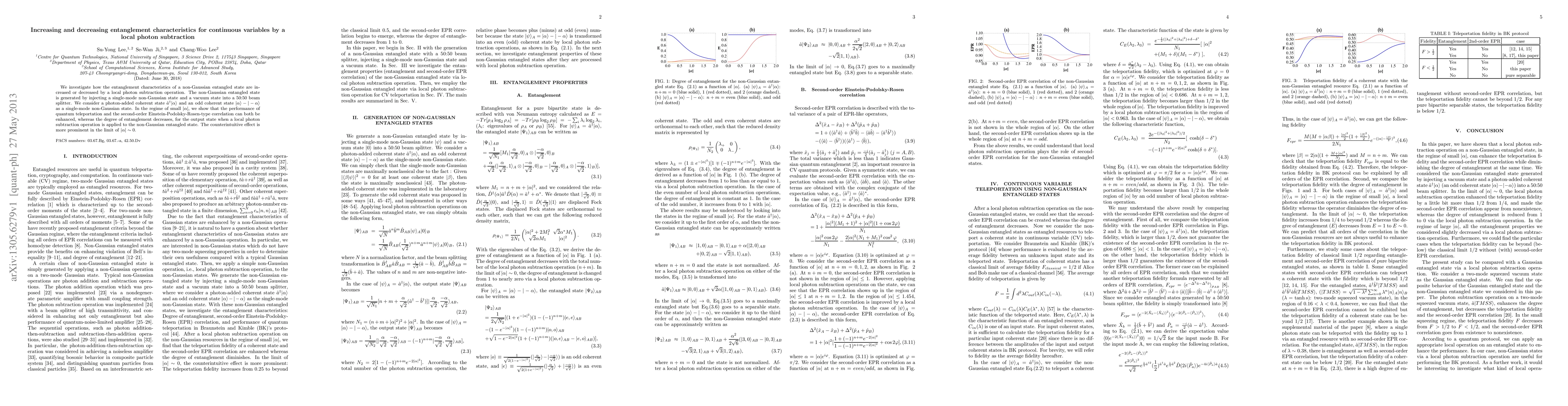 This paper explores how local photon subtraction affects the entanglement characteristics of a non-Gaussian entangled state, showing that while quantum teleportation and second-order correlations improve, the overall entanglement degree decreases, especially at small amplitudes. The effect is most pronounced near zero amplitude.