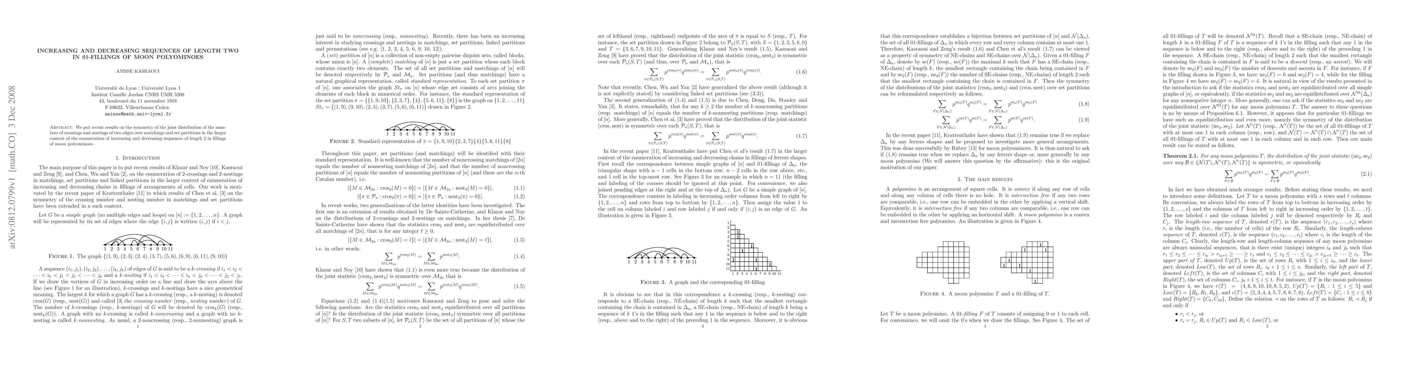 Summary: This study examines the enumeration of increasing and decreasing sequences of length two in 01-fillings of moon polyominoes, contextualizing recent findings on the symmetry of joint distributions of edge crossings and nestings.