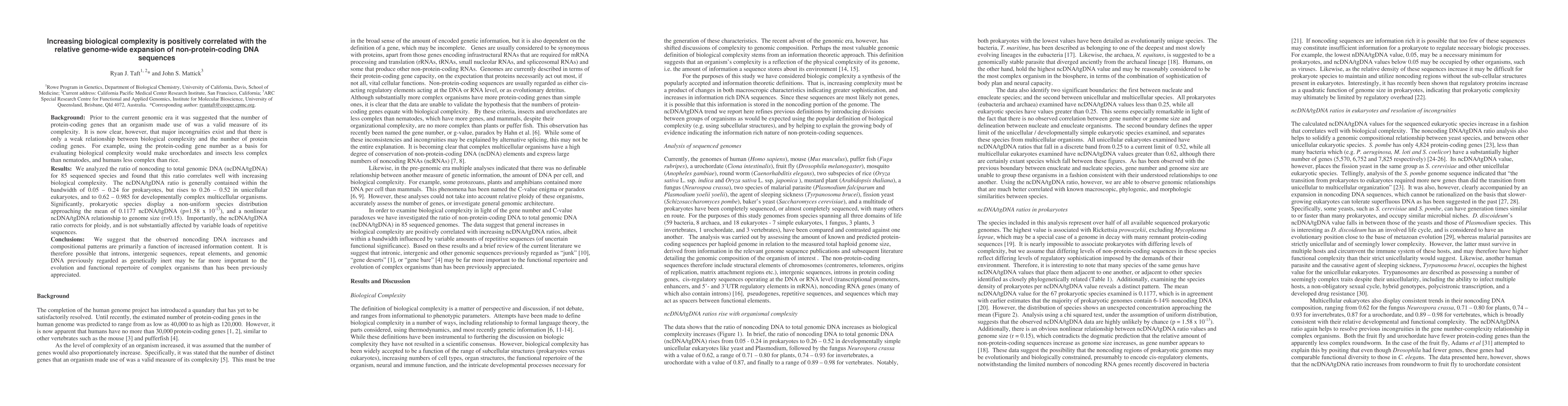 Background: Prior to the current genomic era it was suggested that the number of protein-coding genes that an organism made use of was a valid measure of its complexity. It is now clear, however, that major incongruities exist and that there is only a weak relationship between biological complexity and the number of protein coding genes. For example, using the protein-coding gene number as a basis for evaluating biological complexity would make urochordates and insects less complex than nematodes, and humans less complex than rice. Results: We analyzed the ratio of noncoding to total genomic DNA (ncDNA/tgDNA) for 85 sequenced species and found that this ratio correlates well with increasing biological complexity. The ncDNA/tgDNA ratio is generally contained within the bandwidth of 0.05-0.24 for prokaryotes, but rises to 0.26-0.52 in unicellular eukaryotes, and to 0.62-0.985 for developmentally complex multicellular organisms. Significantly, prokaryotic species display a non-uniform species distribution approaching the mean of 0.1177 ncDNA/tgDNA (p=1.58 x 10^-13), and a nonlinear ncDNA/tgDNA relationship to genome size (r=0.15). Importantly, the ncDNA/tgDNA ratio corrects for ploidy, and is not substantially affected by variable loads of repetitive sequences. Conclusions: We suggest that the observed noncoding DNA increases and compositional patterns are primarily a function of increased information content. It is therefore possible that introns, intergenic sequences, repeat elements, and genomic DNA previously regarded as genetically inert may be far more important to the evolution and functional repertoire of complex organisms than has been previously appreciated.