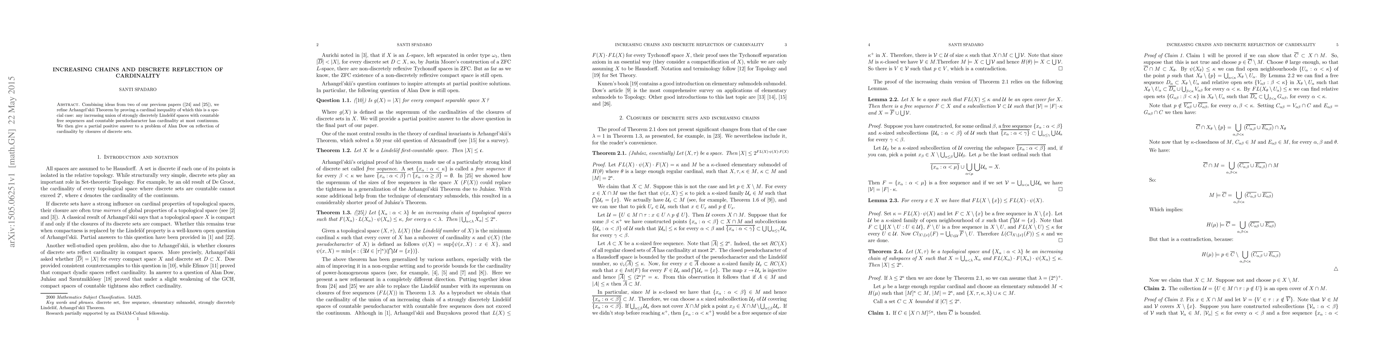 This paper refines Arhangel'skii Theorem by proving that any increasing union of strongly discretely Lindelöf spaces with countable free sequences and countable pseudocharacter has cardinality at most continuum. It also provides a partial solution to a problem by Alan Dow on the reflection of cardinality by closures of discrete sets.