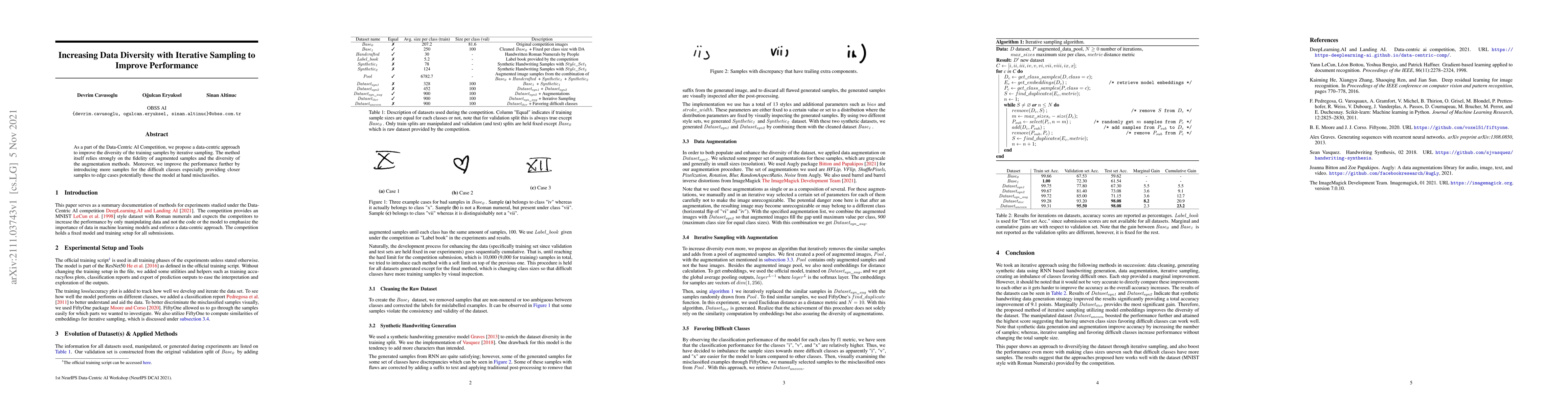 As a part of the Data-Centric AI Competition, we propose a data-centric approach to improve the diversity of the training samples by iterative sampling. The method itself relies strongly on the fidelity of augmented samples and the diversity of the augmentation methods. Moreover, we improve the performance further by introducing more samples for the difficult classes especially providing closer samples to edge cases potentially those the model at hand misclassifies.