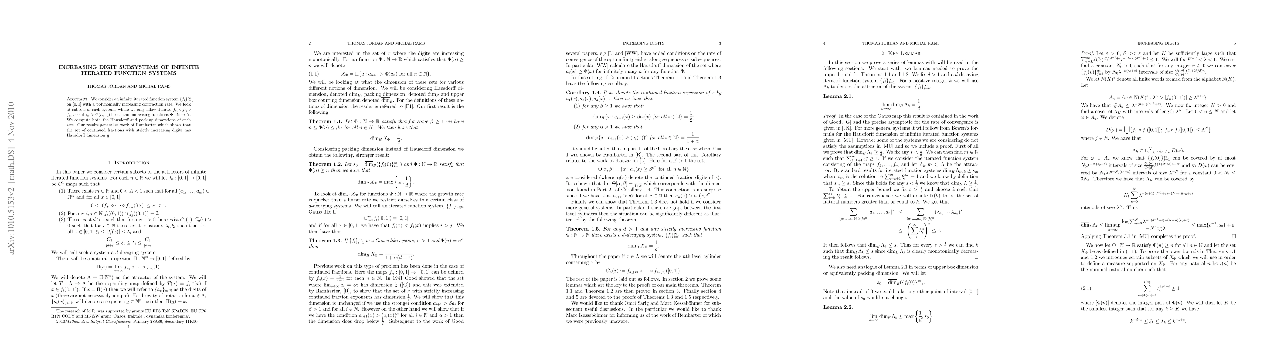 This paper studies infinite iterated function systems with polynomially increasing contraction rates, focusing on subsets where iterates follow a digit subsystem rule. It computes the Hausdorff and packing dimensions of these subsets, generalizing previous results on continued fractions with strictly increasing digits.