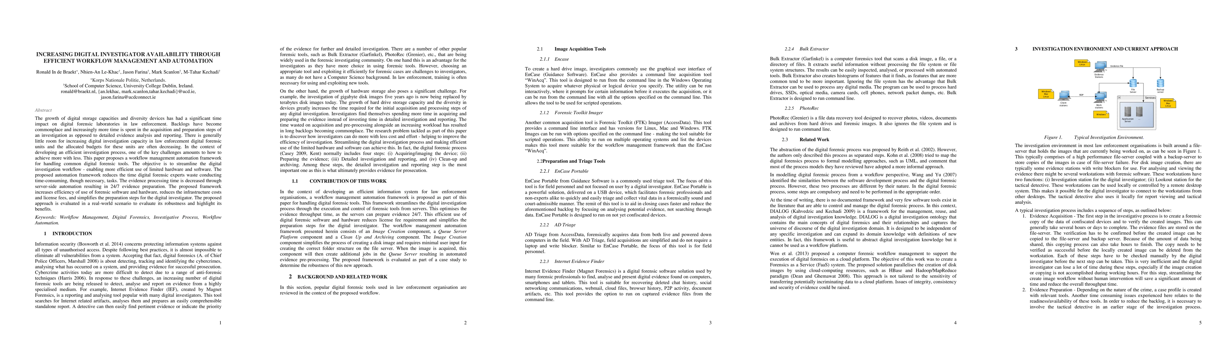 This paper proposes a workflow management automation framework to enhance digital forensic investigation efficiency by reducing acquisition and preparation time, thereby enabling 24/7 evidence preparation. The framework aims to optimize the use of limited resources and reduce costs, ultimately improving investigator availability and capacity.