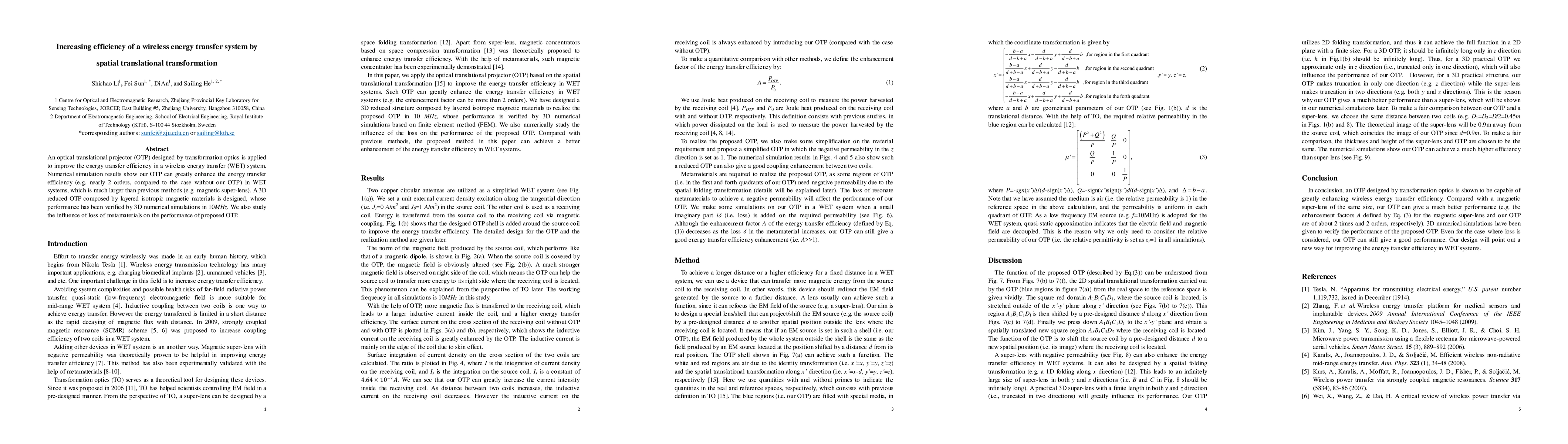 An optical translational projector (OTP) designed by transformation optics is applied to improve the energy transfer efficiency in a wireless energy transfer (WET) system. Numerical simulation results show our OTP can greatly enhance the energy transfer efficiency (e.g. nearly 2 orders, compared to the case without our OTP) in WET systems, which is much larger than previous methods (e.g. magnetic super-lens). A 3D reduced OTP composed by layered isotropic magnetic materials is designed, whose performance has been verified by 3D numerical simulations in 10MHz. We also study the influence of loss of metamaterials on the performance of proposed OTP.