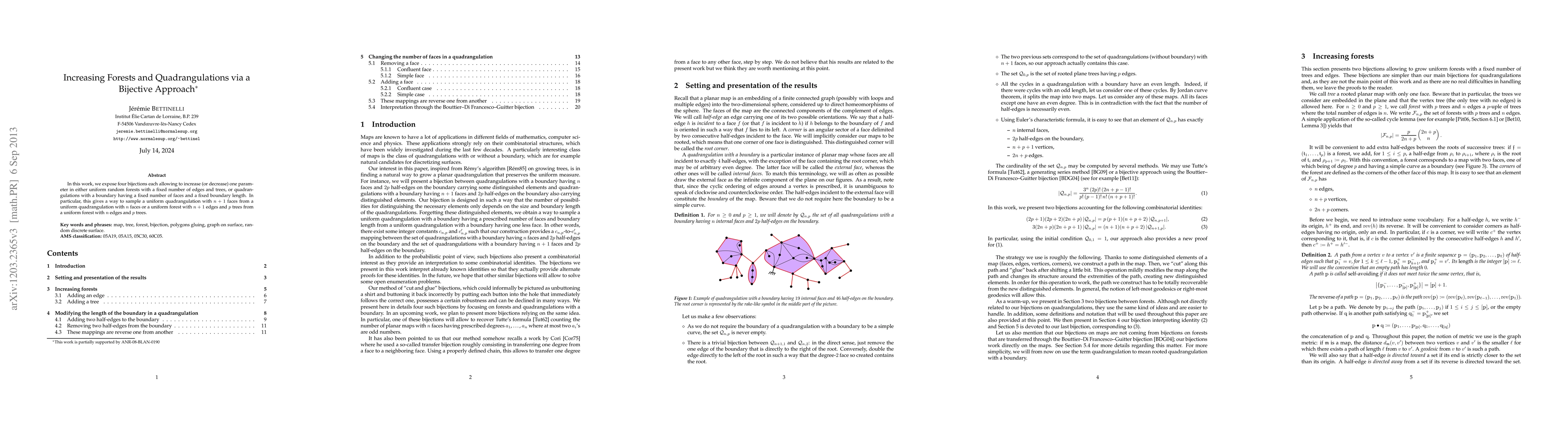 In this work, we expose four bijections each allowing to increase (or decrease) one parameter in either uniform random forests with a fixed number of edges and trees, or quadrangulations with a boundary having a fixed number of faces and a fixed boundary length. In particular, this gives a way to sample a uniform quadrangulation with n + 1 faces from a uniform quadrangulation with n faces or a uniform forest with n+1 edges and p trees from a uniform forest with n edges and p trees.