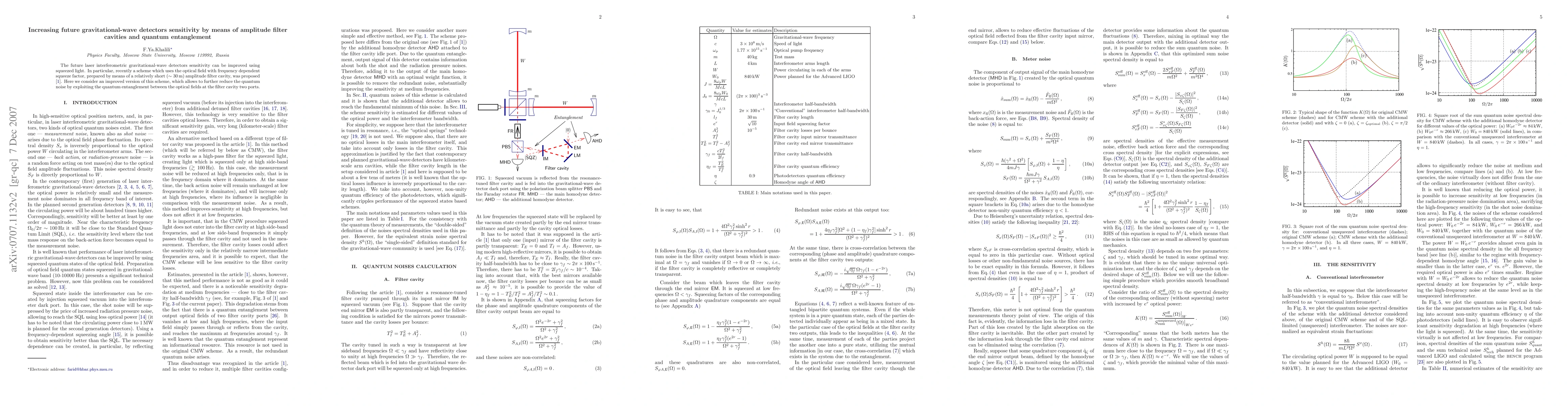 The future laser interferometric gravitational-wave detectors sensitivity can be improved using squeezed light. In particular, recently a scheme which uses the optical field with frequency dependent squeeze factor, prepared by means of a relatively short (~30 m) amplitude filter cavity, was proposed \cite{Corbitt2004-3}. Here we consider an improved version of this scheme, which allows to further reduce the quantum noise by exploiting the quantum entanglement between the optical fields at the filter cavity two ports.