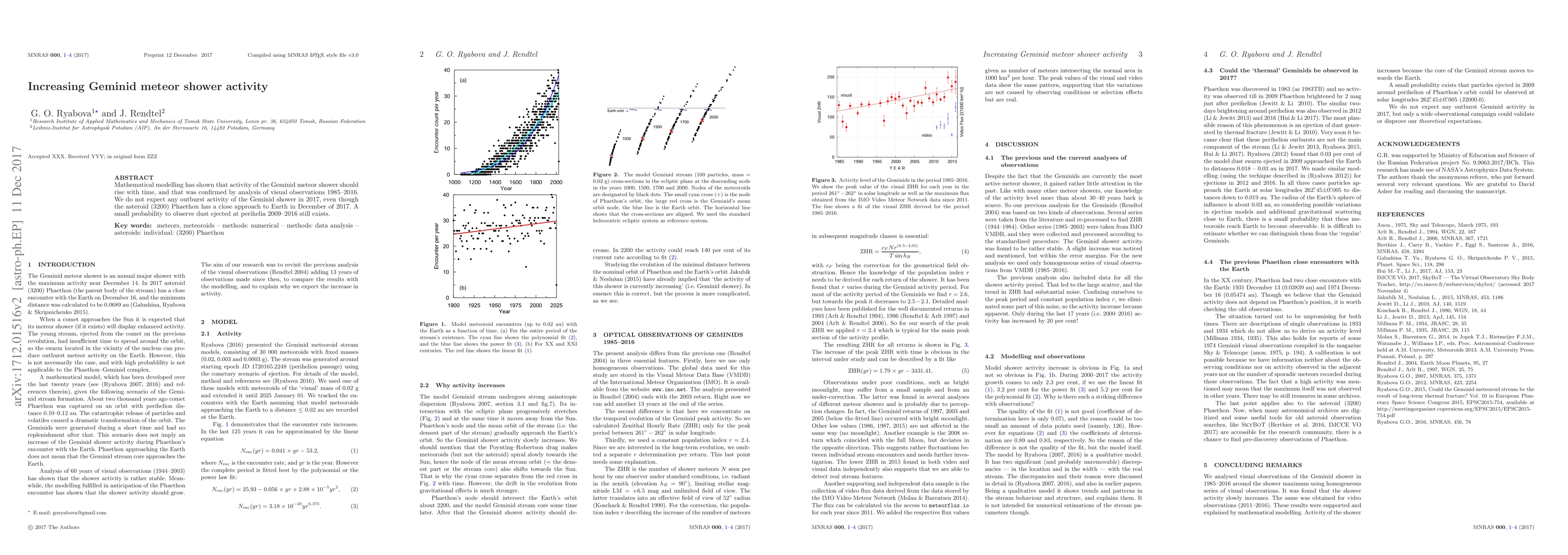 Mathematical modelling and observational analysis confirm that Geminid meteor shower activity is expected to rise over time, with a small probability of dust ejected in 2017 due to asteroid (3200) Phaethon's close approach.