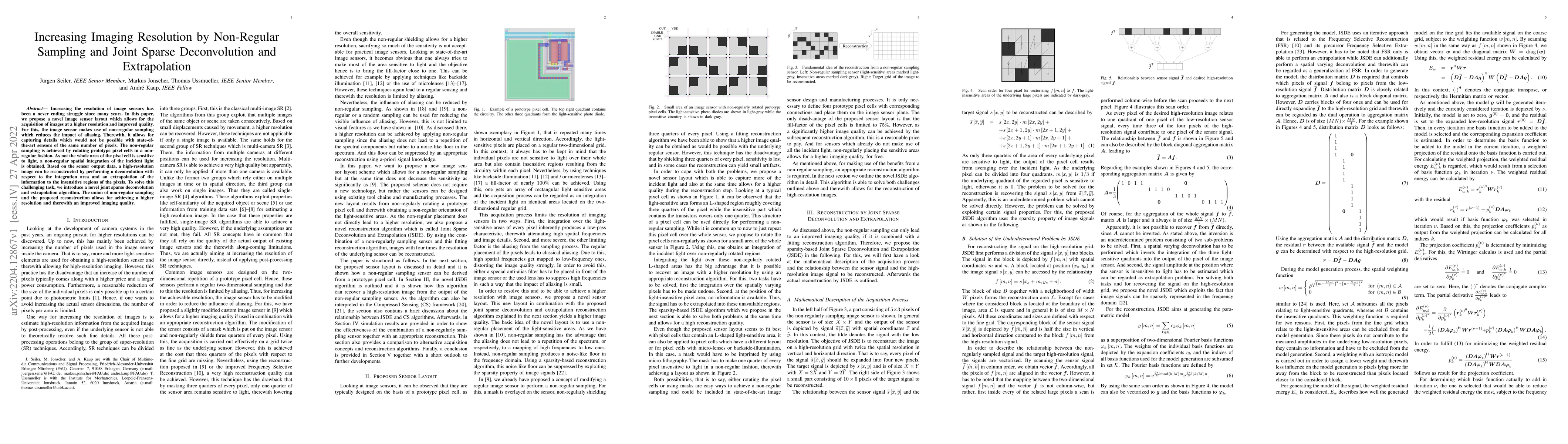 Increasing the resolution of image sensors has been a never ending struggle since many years. In this paper, we propose a novel image sensor layout which allows for the acquisition of images at a higher resolution and improved quality. For this, the image sensor makes use of non-regular sampling which reduces the impact of aliasing. Therewith, it allows for capturing details which would not be possible with state-of-the-art sensors of the same number of pixels. The non-regular sampling is achieved by rotating prototype pixel cells in a non-regular fashion. As not the whole area of the pixel cell is sensitive to light, a non-regular spatial integration of the incident light is obtained. Based on the sensor output data, a high-resolution image can be reconstructed by performing a deconvolution with respect to the integration area and an extrapolation of the information to the insensitive regions of the pixels. To solve this challenging task, we introduce a novel joint sparse deconvolution and extrapolation algorithm. The union of non-regular sampling and the proposed reconstruction allows for achieving a higher resolution and therewith an improved imaging quality.