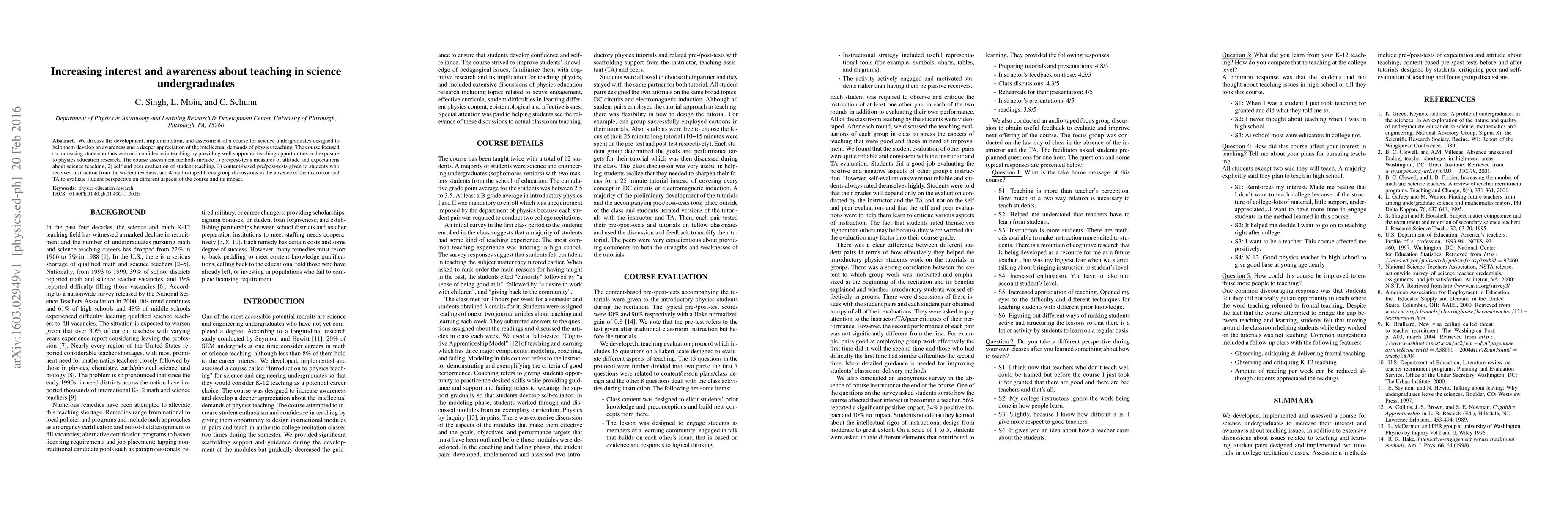 This study developed and assessed a course aimed at enhancing science undergraduates' interest and awareness in physics teaching, employing pre/post-tests, self and peer evaluations, content-based assessments, and focus group discussions to gauge student enthusiasm, confidence, and understanding.