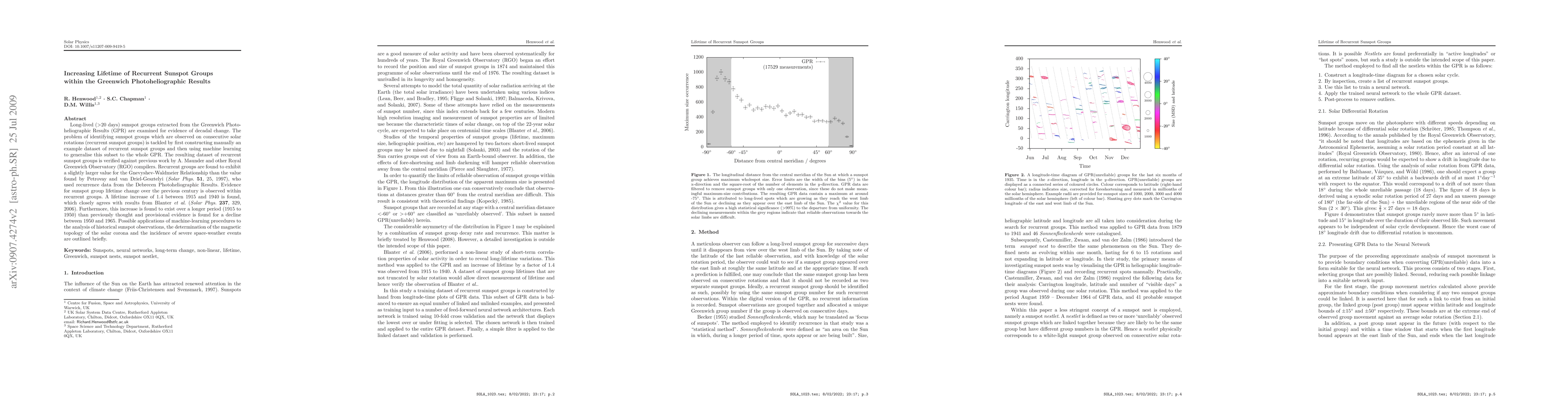 Long-lived (>20 days) sunspot groups extracted from the Greenwich Photo- heliographic Results (GPR) are examined for evidence of decadal change. The problem of identifying sunspot groups which are observed on consecutive solar rotations (recurrent sunspot groups) is tackled by first constructing manually an example dataset of recurrent sunspot groups and then using machine learning to generalise this subset to the whole GPR. The resulting dataset of recurrent sunspot groups is verified against previous work by A. Maunder and other Royal Greenwich Observatory (RGO) compilers. Recurrent groups are found to exhibit a slightly larger value for the Gnevyshev-Waldmeier Relationship than the value found by Petrovay and van Driel-Gesztelyi (Solar Phys. 51, 25, 1997), who used recurrence data from the Debrecen Photoheliographic Results. Evidence for sunspot group lifetime change over the previous century is observed within recurrent groups. A lifetime increase of 1.4 between 1915 and 1940 is found, which closely agrees with results from Blanter et al. (Solar Phys. 237, 329, 2006). Furthermore, this increase is found to exist over a longer period (1915 to 1950) than previously thought and provisional evidence is found for a decline between 1950 and 1965. Possible applications of machine-learning procedures to the analysis of historical sunspot observations, the determination of the magnetic topology of the solar corona and the incidence of severe space-weather events are outlined briefly.