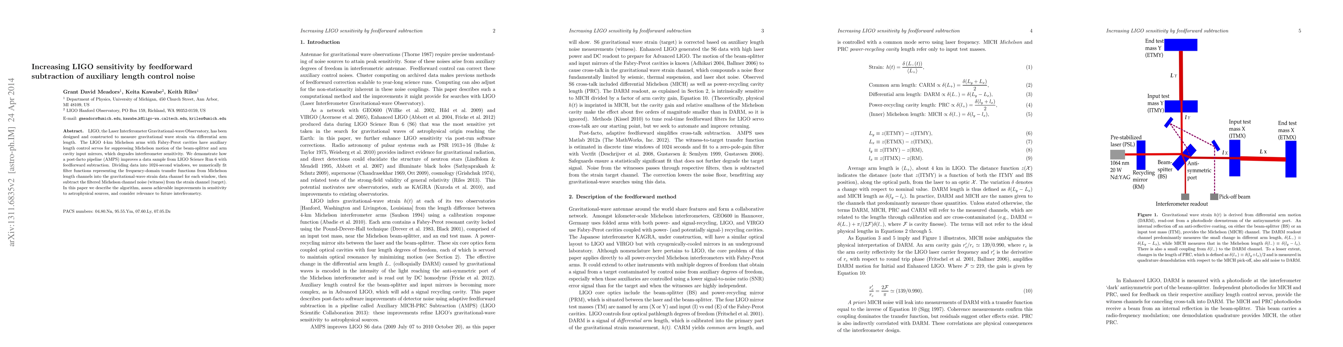 This paper presents an AMPS algorithm that enhances LIGO's sensitivity by subtracting auxiliary length control noise through feedforward subtraction, demonstrating significant improvements in data samples from LIGO Science Run 6 and discussing its implications for future gravitational wave detections.