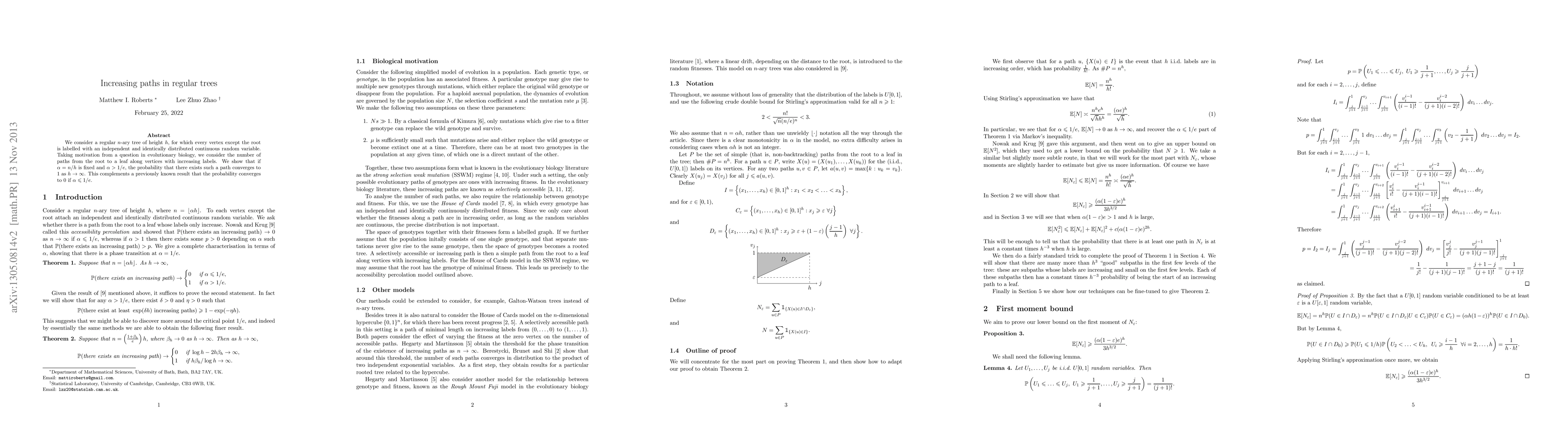 We consider a regular $n$-ary tree of height $h$, for which every vertex except the root is labelled with an independent and identically distributed continuous random variable. Taking motivation from a question in evolutionary biology, we consider the number of simple paths from the root to a leaf along vertices with increasing labels. We show that if $\alpha = n/h$ is fixed and $\alpha > 1/e$, the probability there exists such a path converges to 1 as $h \to \infty$. This complements a previously known result that the probability converges to 0 if $\alpha \leq 1/e$.