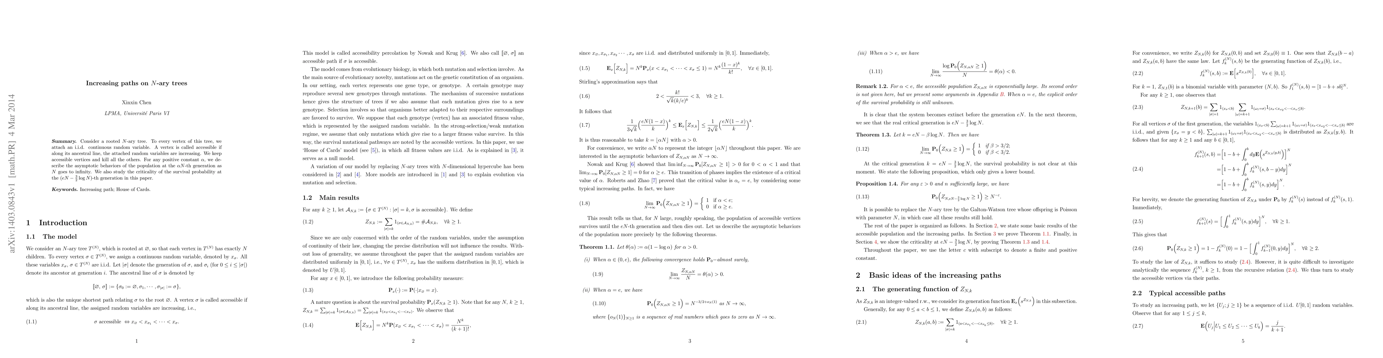 Consider a rooted $N$-ary tree. To every vertex of this tree, we attach an i.i.d. continuous random variable. A vertex is called accessible if along its ancestral line, the attached random variables are increasing. We keep accessible vertices and kill all the others. For any positive constant $\alpha$, we describe the asymptotic behaviors of the population at the $\alpha N$-th generation as $N$ goes to infinity. We also study the criticality of the survival probability at the $(eN-\frac{3}{2}\log N)$-th generation in this paper.
