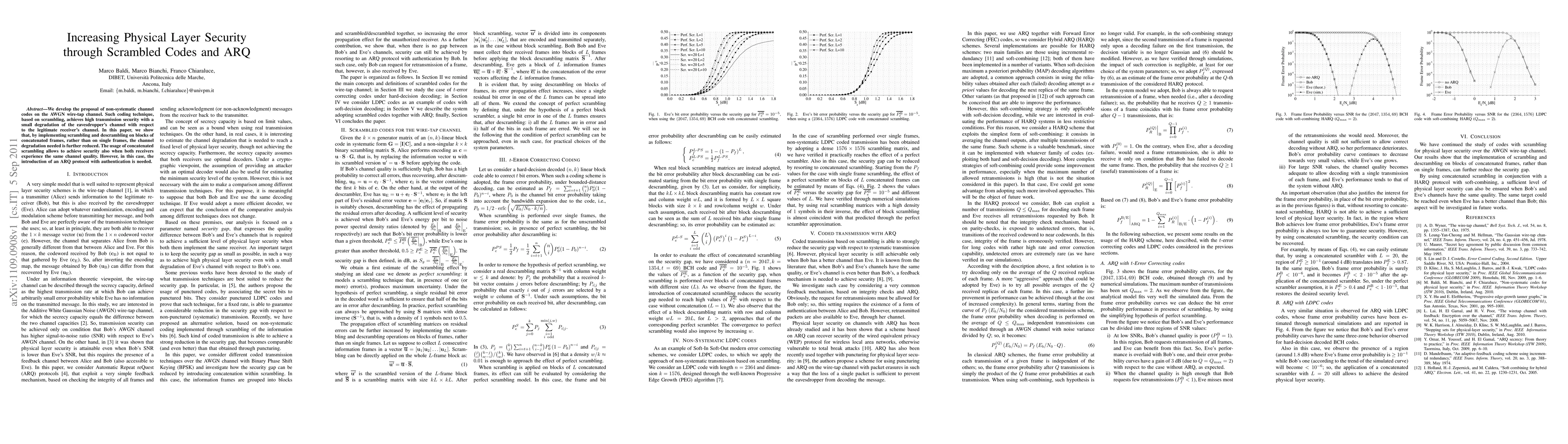 This paper proposes using scrambled codes on the AWGN wire-tap channel to enhance physical layer security, achieving high security with minimal eavesdropper channel degradation. Implementing scrambling on concatenated frames further reduces this degradation, enabling security even when both receivers share the same channel quality, though an ARQ protocol with authentication is required.