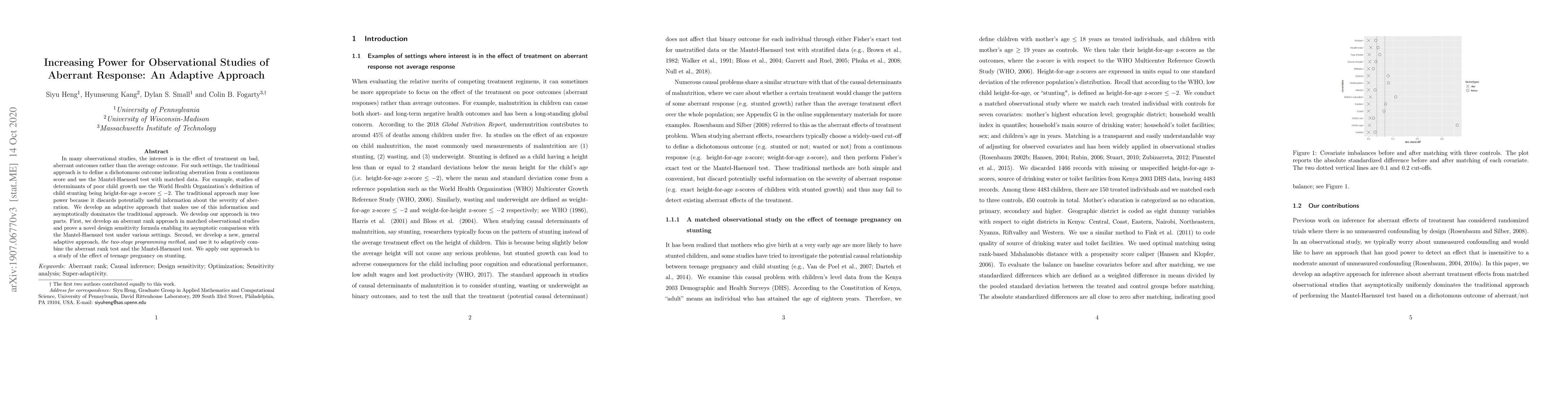 In many observational studies, the interest is in the effect of treatment on bad, aberrant outcomes rather than the average outcome. For such settings, the traditional approach is to define a dichotomous outcome indicating aberration from a continuous score and use the Mantel-Haenszel test with matched data. For example, studies of determinants of poor child growth use the World Health Organization's definition of child stunting being height-for-age z-score $\leq -2$. The traditional approach may lose power because it discards potentially useful information about the severity of aberration. We develop an adaptive approach that makes use of this information and asymptotically dominates the traditional approach. We develop our approach in two parts. First, we develop an aberrant rank approach in matched observational studies and prove a novel design sensitivity formula enabling its asymptotic comparison with the Mantel-Haenszel test under various settings. Second, we develop a new, general adaptive approach, the two-stage programming method, and use it to adaptively combine the aberrant rank test and the Mantel-Haenszel test. We apply our approach to a study of the effect of teenage pregnancy on stunting.