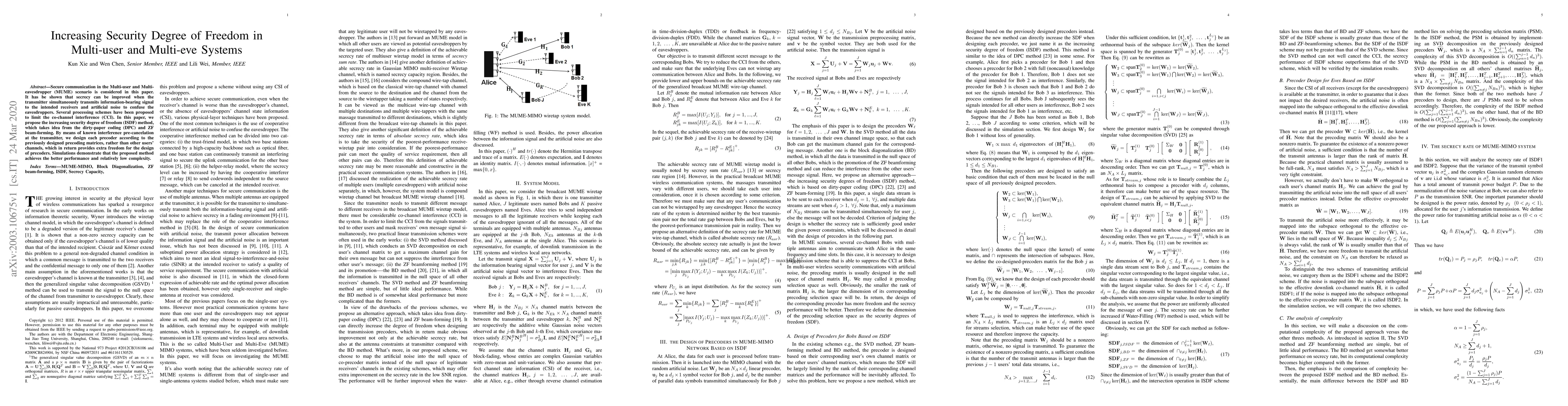 Secure communication in the Multi-user and Multi-eavesdropper (MUME) scenario is considered in this paper. It has be shown that secrecy can be improved when the transmitter simultaneously transmits information-bearing signal to the intended receivers and artificial noise to confuse the eavesdroppers. Several processing schemes have been proposed to limit the co-channel interference (CCI). In this paper, we propose the increasing security degree of freedom (ISDF) method, which takes idea from the dirty-paper coding (DPC) and ZF beam-forming. By means of known interference pre-cancelation at the transmitter, we design each precoder according to the previously designed precoding matrices, rather than other users' channels, which in return provides extra freedom for the design of precoders. Simulations demonstrate that the proposed method achieves the better performance and relatively low complexity.