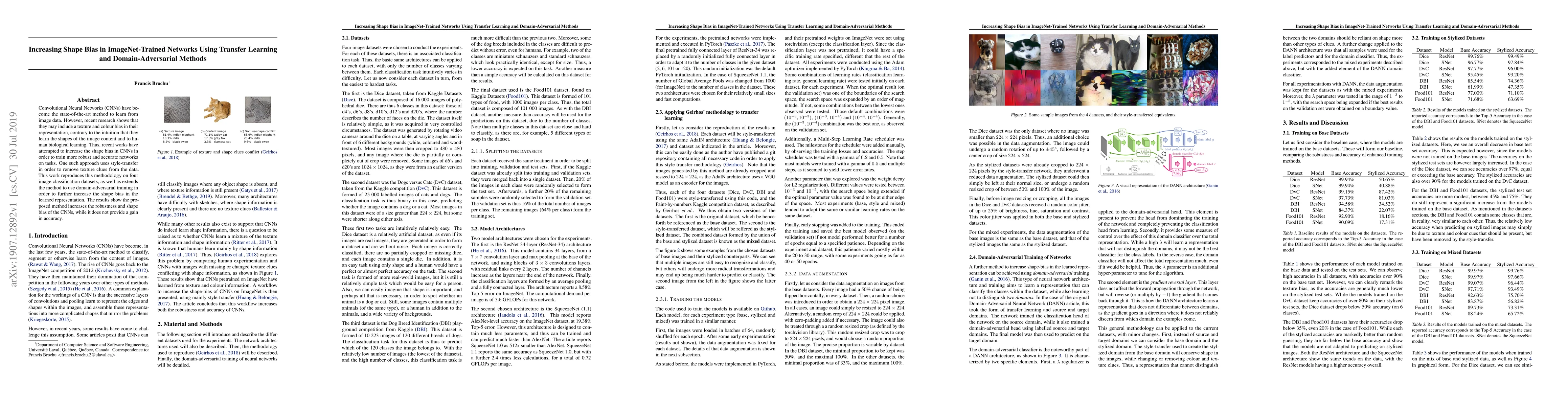 This paper investigates methods to enhance shape bias in ImageNet-trained CNNs using transfer learning and domain-adversarial training, finding that while robustness improves, accuracy remains unchanged.