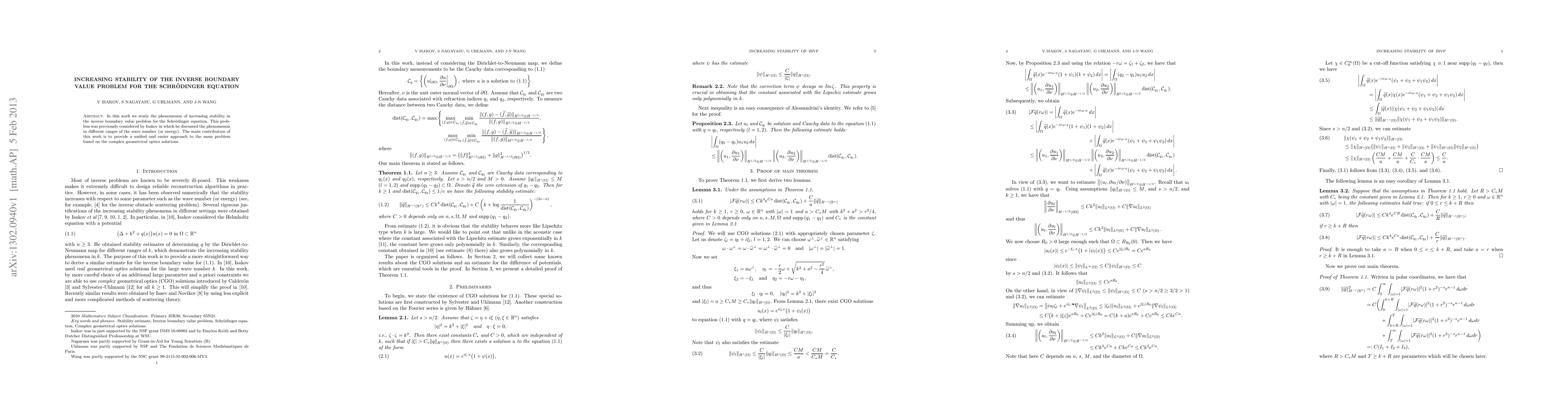 Summary: This paper investigates the increasing stability in the inverse boundary value problem for the Schrödinger equation, offering a unified approach based on complex geometrical optics solutions, contrasting with previous work by Isakov that considered different wave number ranges.