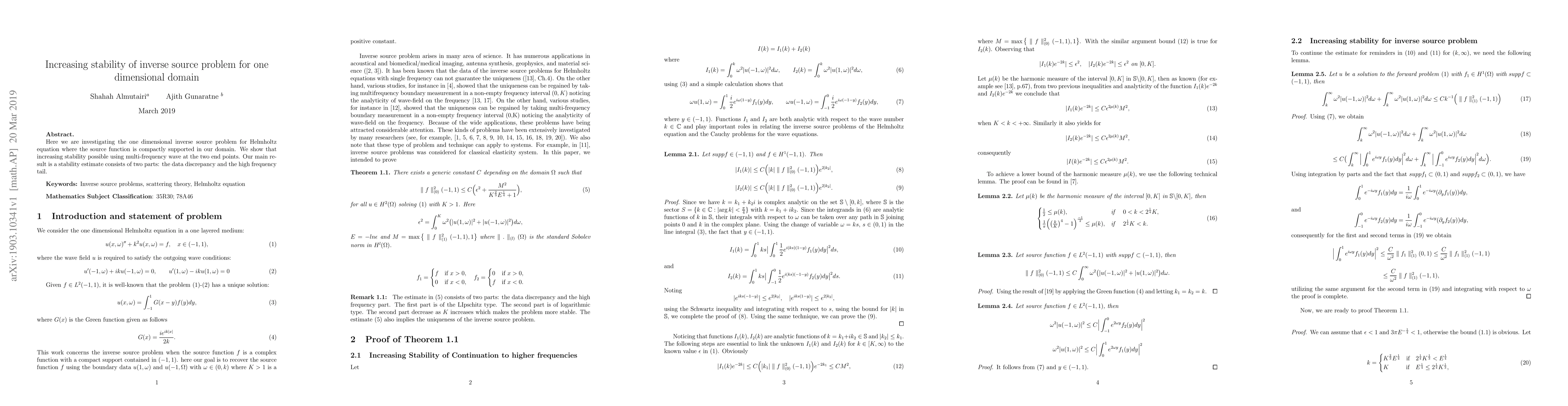 Here we are investigating the one dimensional inverse source problem for Helmholtz equation where the source function is compactly supported in our domain. We show that increasing stability possible using multi-frequency wave at the two end points. Our main result is a stability estimate consists of two parts: the data discrepancy and the high frequency tail.