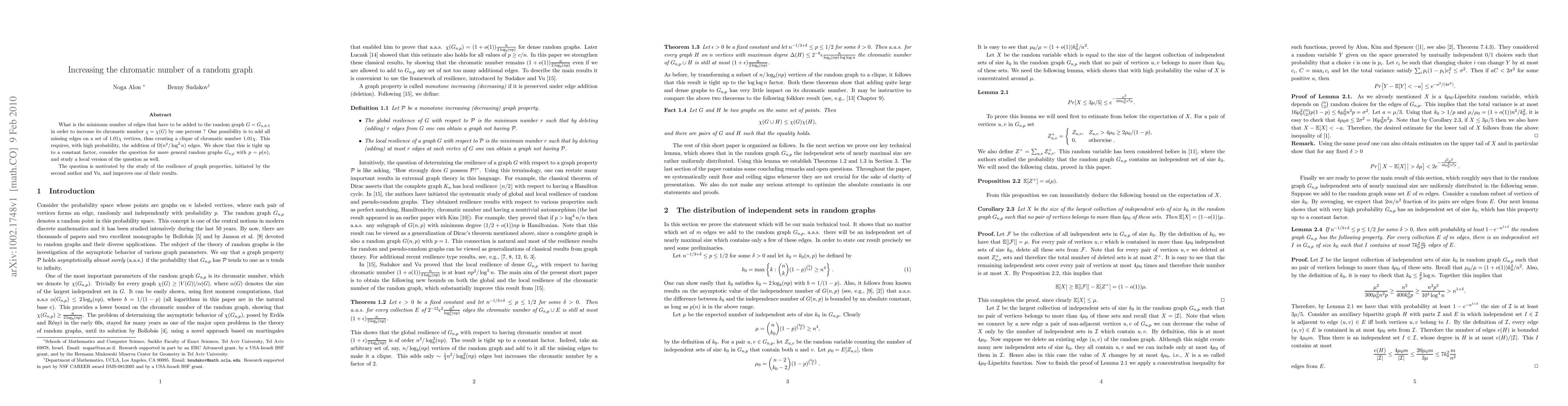What is the minimum number of edges that have to be added to the random graph $G=G_{n,0.5}$ in order to increase its chromatic number $\chi=\chi(G)$ by one percent ? One possibility is to add all missing edges on a set of $1.01 \chi$ vertices, thus creating a clique of chromatic number $1.01 \chi$. This requires, with high probability, the addition of $\Omega(n^2/\log^2 n)$ edges. We show that this is tight up to a constant factor, consider the question for more general random graphs $G_{n,p}$ with $p=p(n)$, and study a local version of the question as well. The question is motivated by the study of the resilience of graph properties, initiated by the second author and Vu, and improves one of their results.
