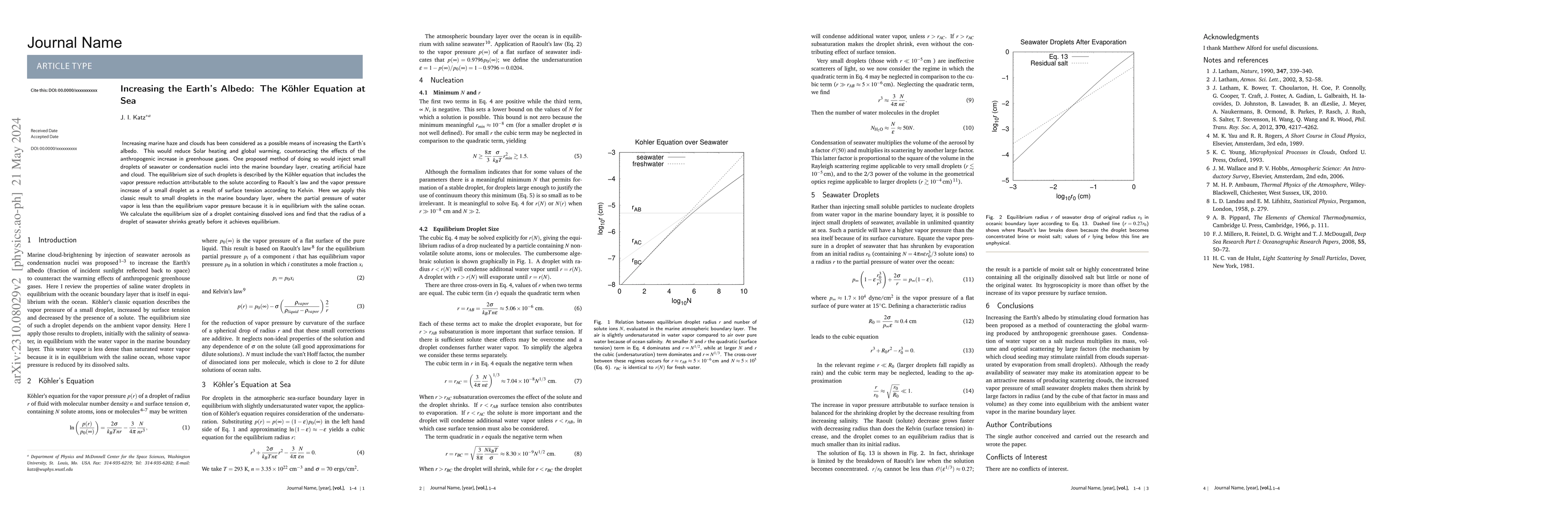 This paper investigates the use of marine haze and clouds to increase Earth's albedo and mitigate global warming, proposing seawater droplet injection as a method. It applies the Köhler equation to determine the equilibrium size of these droplets, finding that seawater droplets shrink significantly before reaching equilibrium due to the partial water vapor pressure in the marine boundary layer.