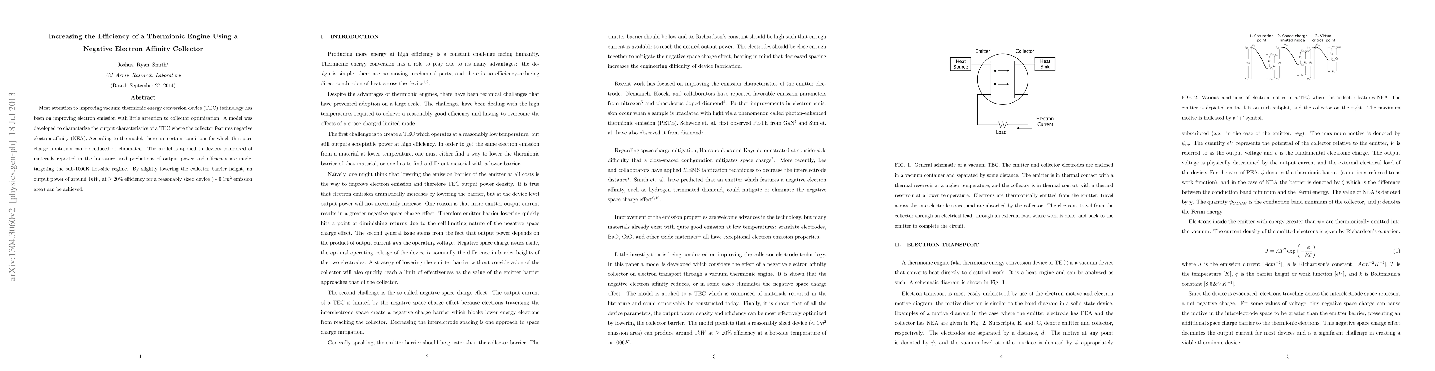 This paper develops a model to optimize the collector in a thermionic engine using negative electron affinity, aiming to enhance efficiency. The model predicts that reducing the collector barrier can significantly improve output power and efficiency, achieving around $1kW$ at $\geq 20%$ efficiency for a device with a $\sim 0.1m^{2}$ emission area.