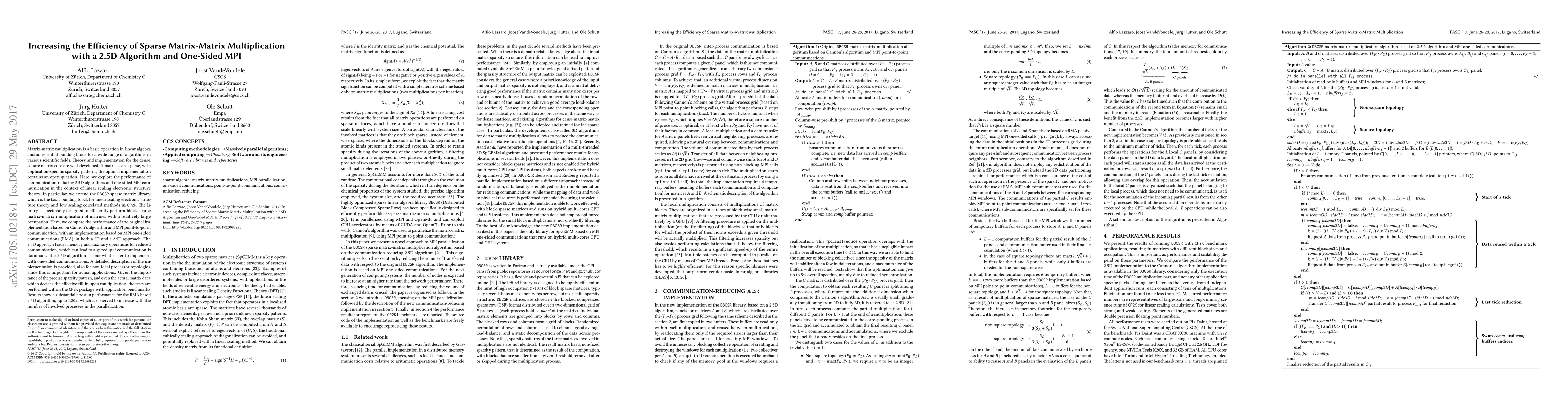 This paper investigates the efficiency of sparse matrix-matrix multiplication using a 2.5D algorithm and one-sided MPI communication, specifically within the context of linear scaling electronic structure theory. The results demonstrate a significant performance boost, up to 1.80x, compared to traditional implementations, especially as the number of parallel processes increases.