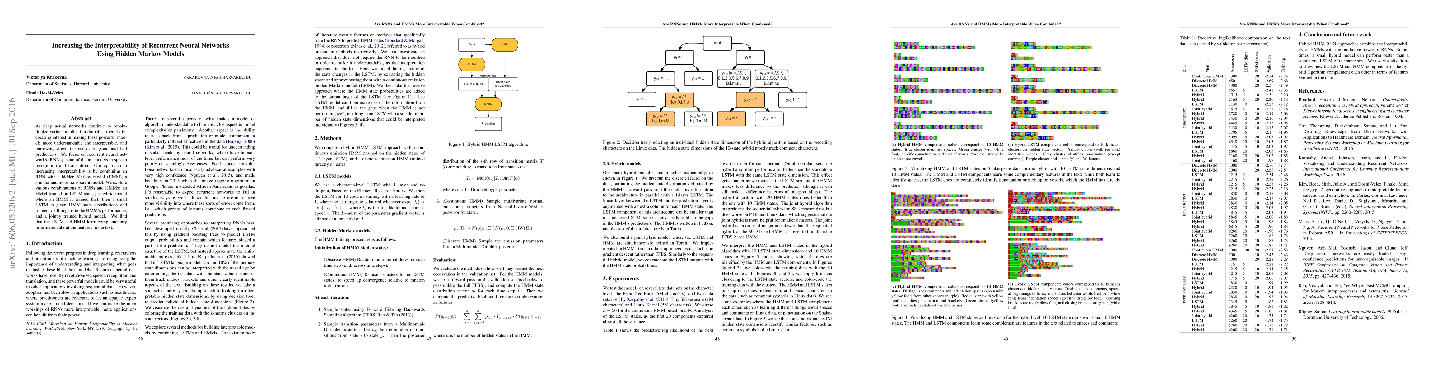As deep neural networks continue to revolutionize various application domains, there is increasing interest in making these powerful models more understandable and interpretable, and narrowing down the causes of good and bad predictions. We focus on recurrent neural networks (RNNs), state of the art models in speech recognition and translation. Our approach to increasing interpretability is by combining an RNN with a hidden Markov model (HMM), a simpler and more transparent model. We explore various combinations of RNNs and HMMs: an HMM trained on LSTM states; a hybrid model where an HMM is trained first, then a small LSTM is given HMM state distributions and trained to fill in gaps in the HMM's performance; and a jointly trained hybrid model. We find that the LSTM and HMM learn complementary information about the features in the text.